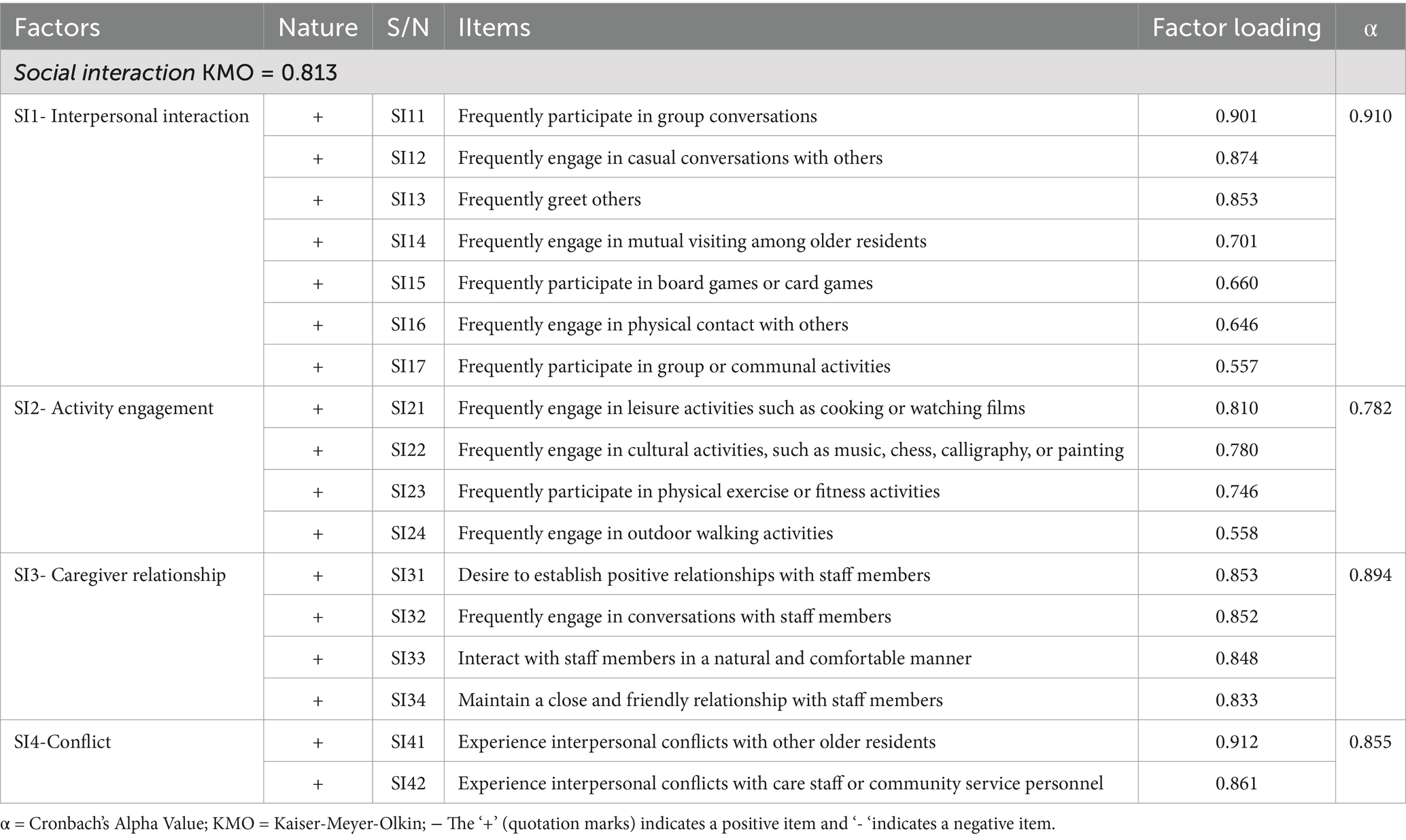 Table 3. Factor analysis and reliability of social interaction factors of older people.