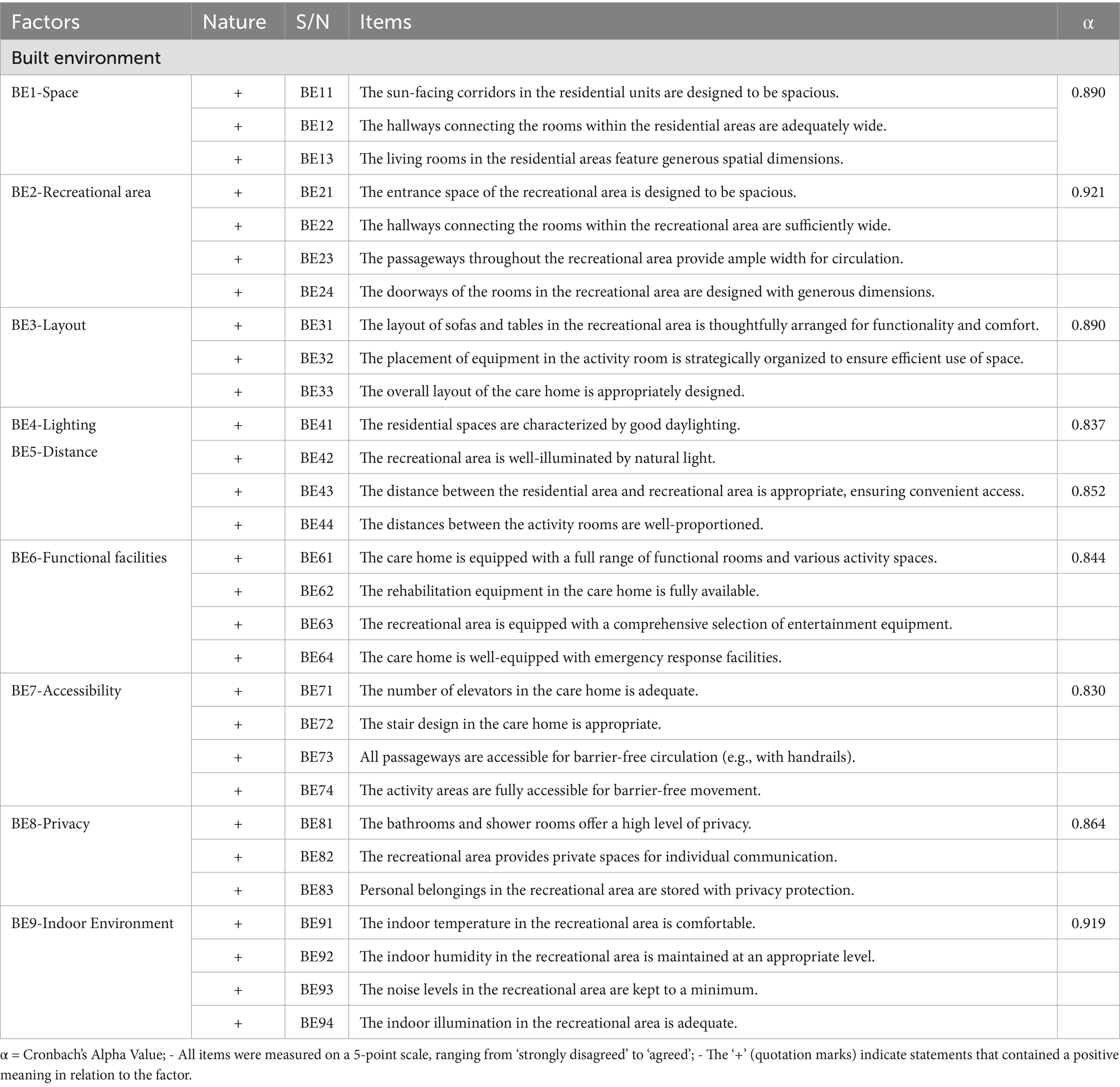 Table 4. Reliability analysis for built environment factors in care homes.