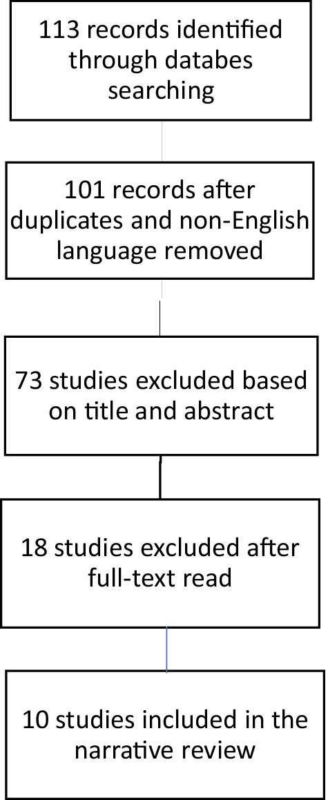 One hundred and thirteen articles were identified from the selected database. Twelve duplicates and articles not written in English were excluded. Seventy-three manuscripts were excluded after screening the titles and abstracts. Of the 28 studies assessed for full-text eligibility, 18 were excluded. Ten articles were finally included in this narrative review (Figure 1), published from 2006 to 2025.