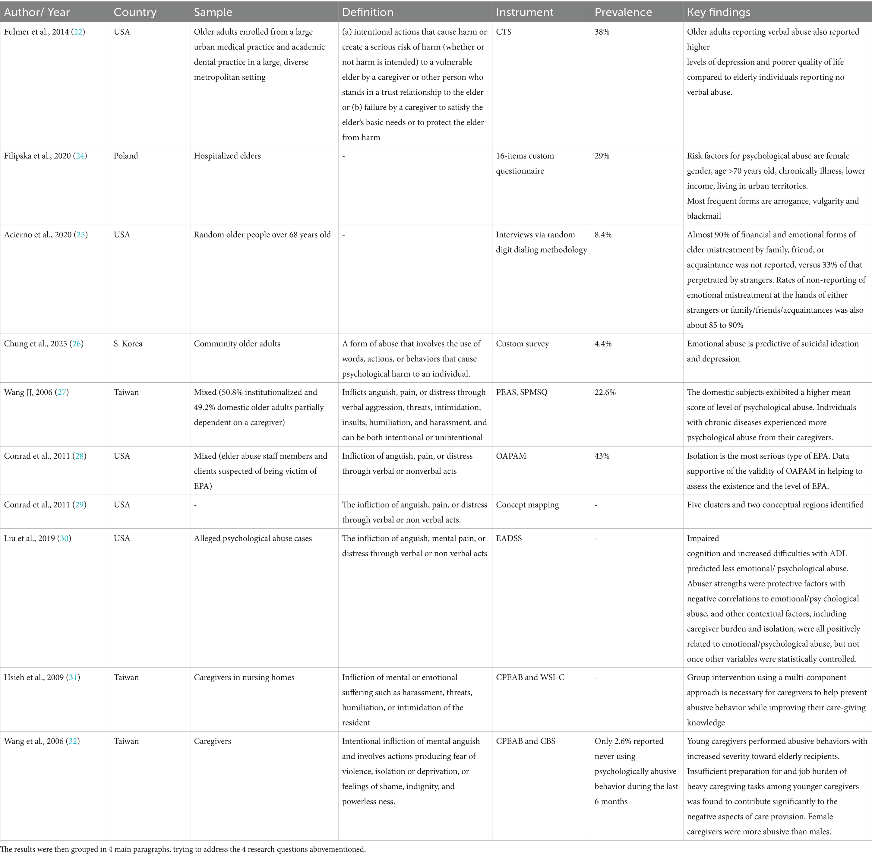 Discussion and conclusions: The available literature on Elder Psychological Abuse is still limited and fragmented, with a small number of studies dedicated to this specific topic, the absence of a shared definition and the lack of standardized categorization and assessment tools. These elements underscore the need for further research to explore the phenomenon in depth, promoting the development of a single definition and reliable tools for its identification and classification.