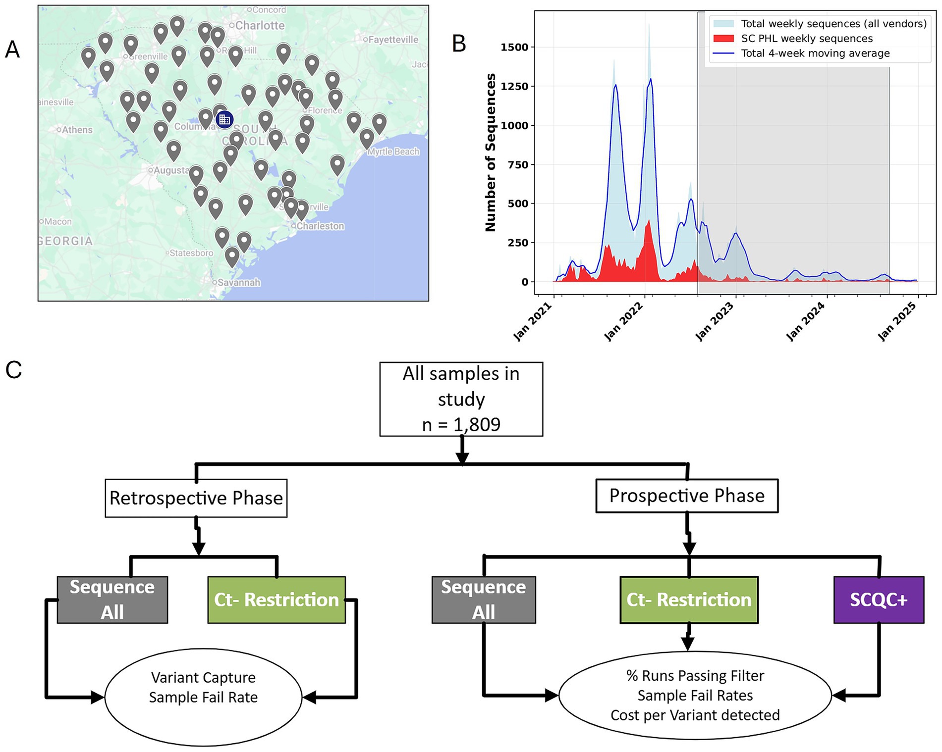 Figure 1. South Carolina has a centralized public health system that enables sampling of clinical cases throughout the state. (A) As a state with a centralized public health system, all local health department offices throughout the state, indicated by gray icons, are joined together in one surveillance network, with sequencing of samples carried out centrally at the SCPHL, as indicated by the blue building icon. (B) An overview of the sequencing effort of the state public health laboratory, in red, versus the total number of sequences from other sources in the state, in blue. The shaded area indicates the period of study for this publication. (C) An overview of the study design and its two phases aimed at determining a cost-effective approach for real time variant surveillance during a public health emergency.
