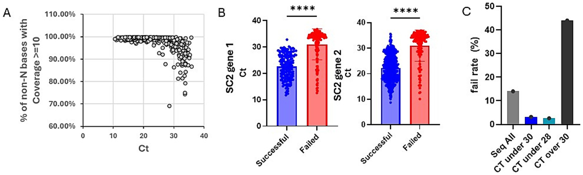 Figure 2. Simulated data suggests Ct restriction is cost effective but does not capture all variants in circulation. (A) Chart showing the Ct values of 811 samples vs. a measure of genome coverage, % of non-N bases with coverage >/= 10. (B) Chart showing the Ct values for the two PCR gene targets, Orf1 and N gene, of SARS-CoV-2 positive samples. Successful samples are shown in blue and the failed in red. Chart was generated on Graphpad Prism and statistical significance was determined by student t-test. (C) Chart showing sequencing fail rate for different sample sub-population based on Ct. Referenced data was based on 948 samples collected and sequenced between June through August 2022. Chart was generated on Graphpad Prism and statistical significance was determined by student t-test.