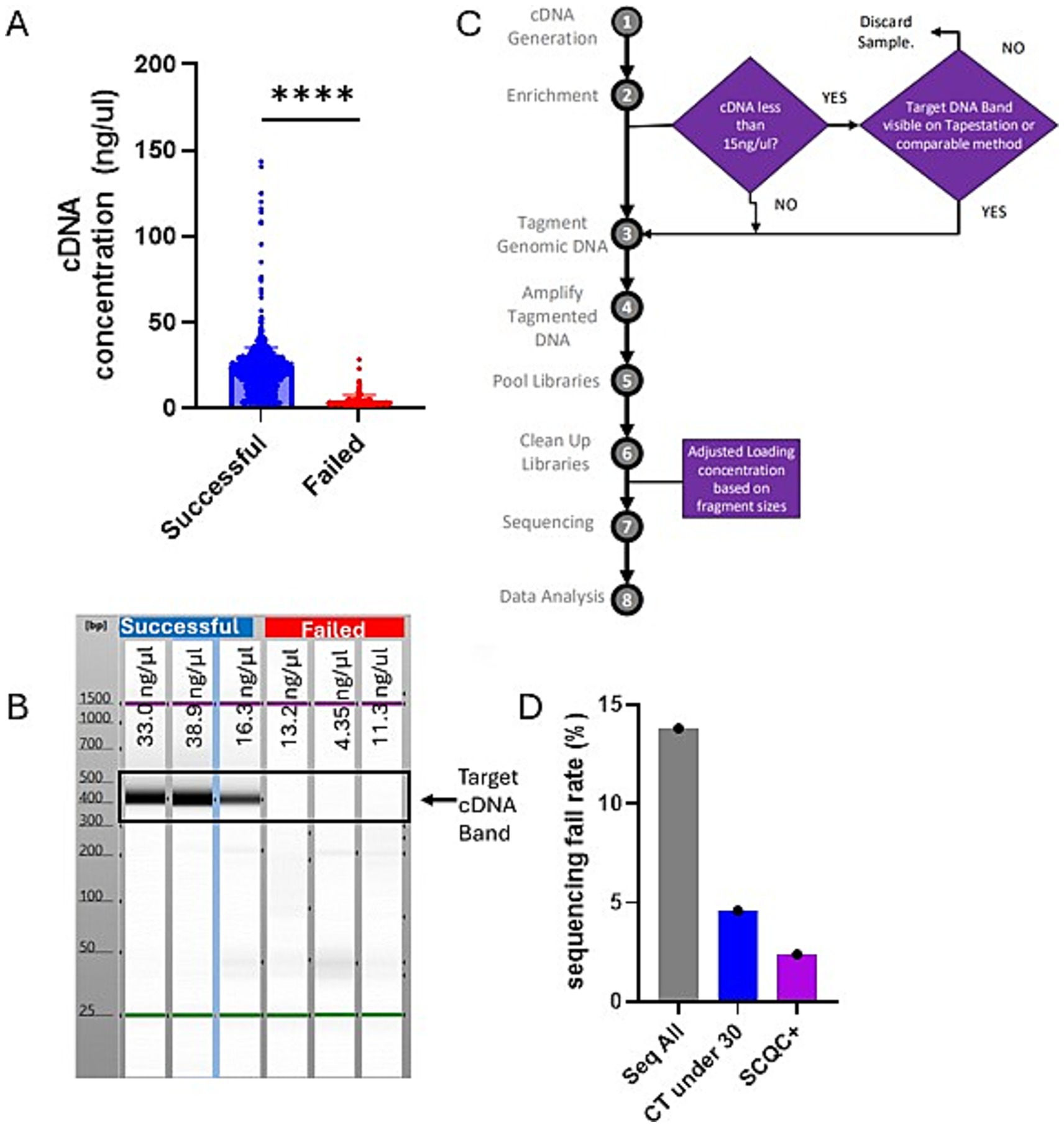 The prospective phase of our study was initiated by the observation that successful samples tended to have significantly higher cDNA concentrations early in the library prep process (Figure 3A). Additionally running the cDNA on a Agilent TapeStation instrument, an automated agarose electrophoresis machine, showed that failed samples tended to lack the expected target cDNA band (Figure 3B).