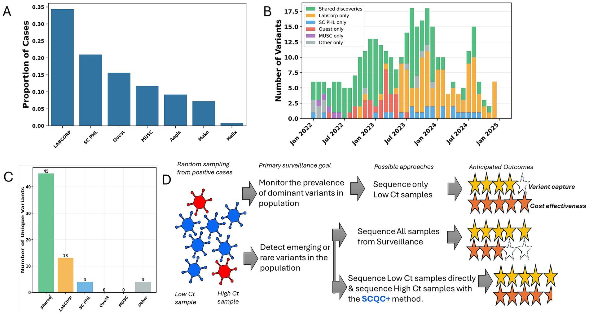 Figure 4. Commercial and clinical lab support throughout state contributed to a comprehensive variant surveillance network in South Carolina. (A) Chart showing the proportion of SARS-CoV-2 sequences that were provided by different sequencing laboratories during the study period. (B) Chart showing the number of variant lineages each month that were uniquely detected by different sequencing laboratories or found by more than one facility, labeled “Shared discoveries.” (C) Chart represents a summary of data from the entire study period for unique variants detected exclusively by different sequencing laboratory. (D) A summary of the findings of this case is shown graphically suggesting that the SCQC+ approach enables a more cost-effective approach for detecting rare variants in high Ct sample.