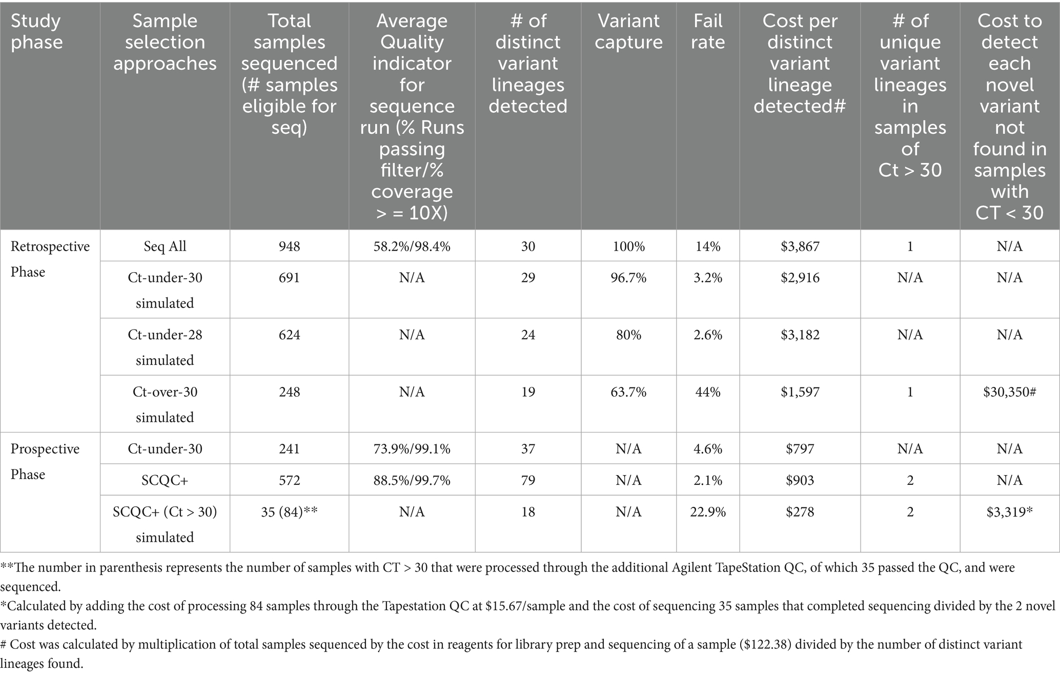 Altogether, the retrospective study suggested that Ct-over-30 approach to selecting samples for sequencing was more cost effective than sequencing all collected samples while enabling the capture of most but not all variants within our surveillance samples.