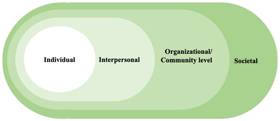 Adopting a health-promoting lifestyle is a complex behavioral process, especially for individuals with chronic conditions such as psoriasis. To better understand the mechanisms underlying such behaviors, theoretical frameworks are essential for identifying both barriers and facilitators. The capability, opportunity, motivation behavior (COM-B) model provides a systematic lens for examining health-related behaviors in healthcare contexts (15, 16). This model posits that engaging in a target behavior requires adequate capability (knowledge and skills), opportunity (social and environmental resources), and motivation (cognitive and emotional drivers) (Figure 1) (17). In parallel, the Social Ecological Model (SEM) highlights that individual behaviors are shaped by multiple levels of influence, including individual, interpersonal, organizational or community level, and societal factors (Figure 2) (18). By situating individual decision-making within broader social and structural contexts, SEM complements the mechanism-oriented focus of COM-B. Guided by the integration of these two frameworks, the present study explores the barriers and facilitators to adopting health-promoting lifestyles among patients with psoriasis in China.