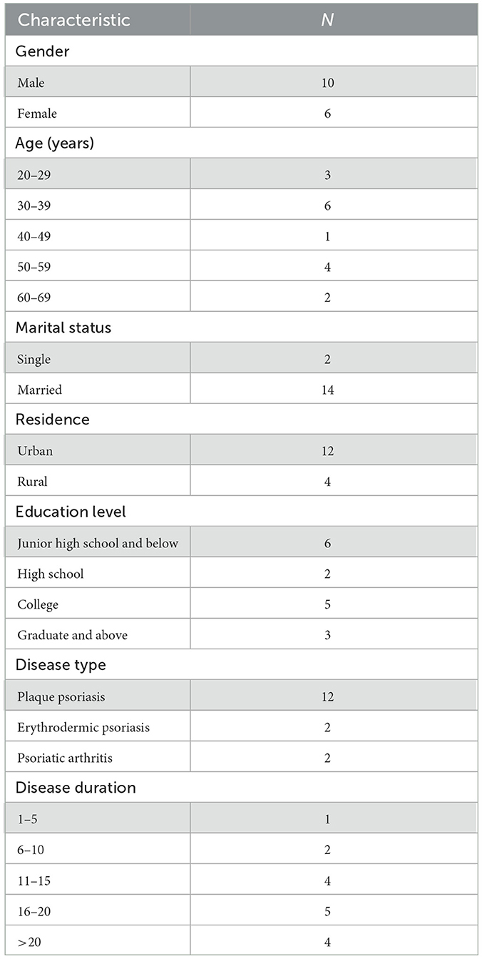 This study included patients diagnosed with psoriasis for a minimum of 6 months who were at least 18 years of age and had no other chronic diseases. A purposive sampling strategy was adopted to achieve diversity in demographic characteristics. Participants were recruited from a WeChat-based psoriasis patient support group established in 2015 and managed by patient representatives in central China. After receiving ethical approval and permission from the group managers, the researcher posted a recruitment notice in the group. Interested patients were provided with detailed information about the study, and those who agreed to participate signed an informed consent form. Data collection continued until meaning saturation was reached—that is, when no new concepts relevant to the research objectives emerged from subsequent interviews (19).
