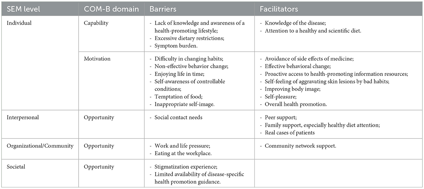 Results: At the individual level, barriers included limited knowledge and awareness, excessive dietary restrictions, symptom burden, difficulty changing habits, ineffective behaviors, enjoying life in time, self-awareness of controllable conditions, food temptation, and inappropriate self-image; facilitators were disease knowledge, healthy diet attention, avoidance of side effects of medicine, effective behavioral change, proactive information seeking, self-feeling of aggravating skin lesions by bad habits, improved body image, self-pleasure, and overall health promotion. At the interpersonal level, barriers were social contact needs, while facilitators included peer and family support and patient role models. At the organizational/community level, barriers were work and life pressure and unhealthy workplace eating, whereas facilitators were community network support. At the societal level, barriers were stigmatization and lack of disease-specific health promotion guidance.
