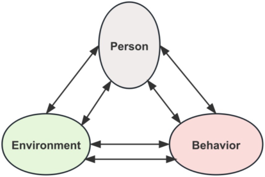 Social cognitive theory, developed by Bandura (15), centers on the model of Triadic Reciprocal Determinism. This framework posits that the relationships between the individual (P), behavior (B), and environment (E) form a dynamic, interactive system, rejecting linear causality.