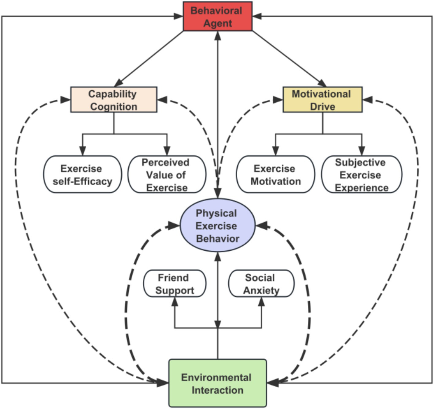The triadic reciprocal determinism model of SCT effectively explains the initiation and maintenance of physical exercise behavior among female university students. Specifically, physical exercise behavior (B) results from interactions between individual factors (P) (e.g., exercise self-efficacy) and environmental factors (E) (e.g., friend support). SCT’s emphasis on dynamic interactions offers a robust theoretical foundation for understanding the formation of this behavior and provides a methodological basis for examining interactive and compensatory effects among influencing factors.