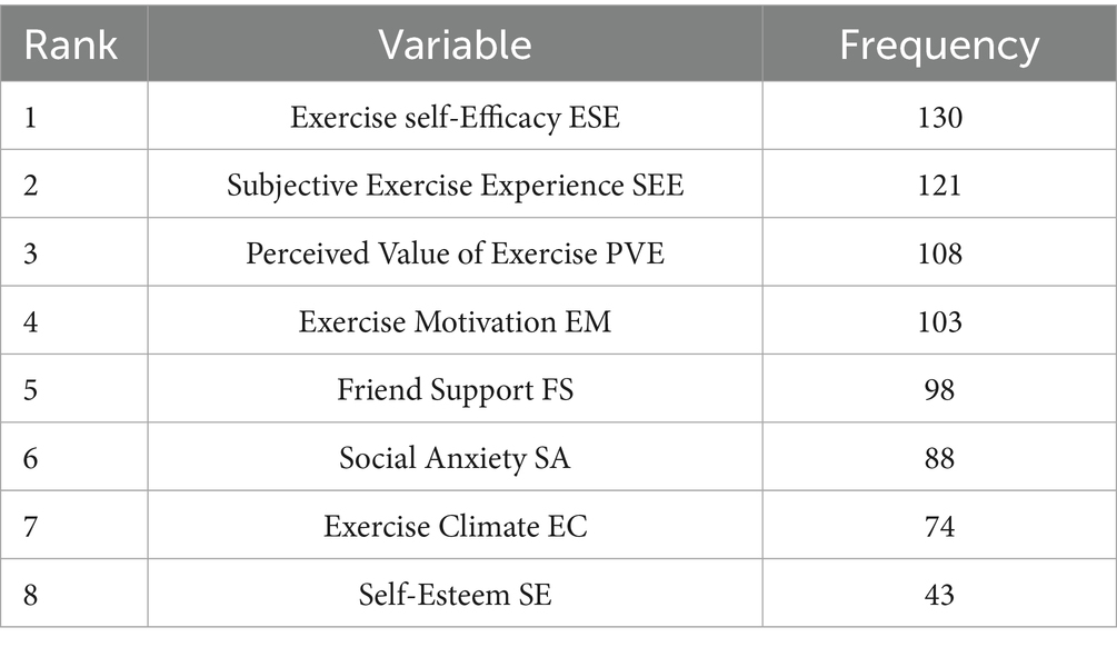 We then conducted a systematic literature review to identify relevant condition variables. Using keywords such as “female university students,” “physical exercise,” and “influencing factors,” we searched CNKI, Web of Science, and PubMed, identifying 163 empirical studies published between 2010 and 2025. Inclusion criteria were: (1) focus on Chinese female university students or valid subgroup analyses of this population; (2) examination of factors influencing physical exercise behavior; (3) relevance of condition variables to SCT constructs; and (4) variable occurrence frequency exceeding 50% of retrieved literature (>81 instances) (Table 1).