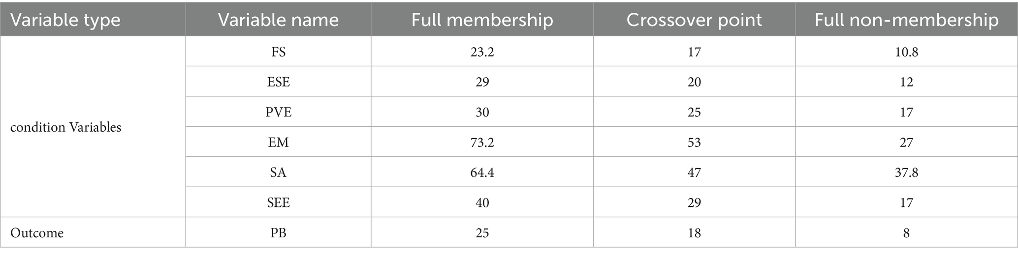Calibration can be performed indirectly, with researchers setting thresholds based on data characteristics and prior literature, or directly, using software functions for automated transformation. We utilized the direct method in fsQCA software version 4.1, following established practice (26) for its superior objectivity and replicability. Informed by both methodological conventions and the specific context of our research, the calibration thresholds were defined as follows: 95% for full membership, 50% for the crossover point, and 5% for full non-membership (27). A detailed presentation of these thresholds is provided in Table 3.