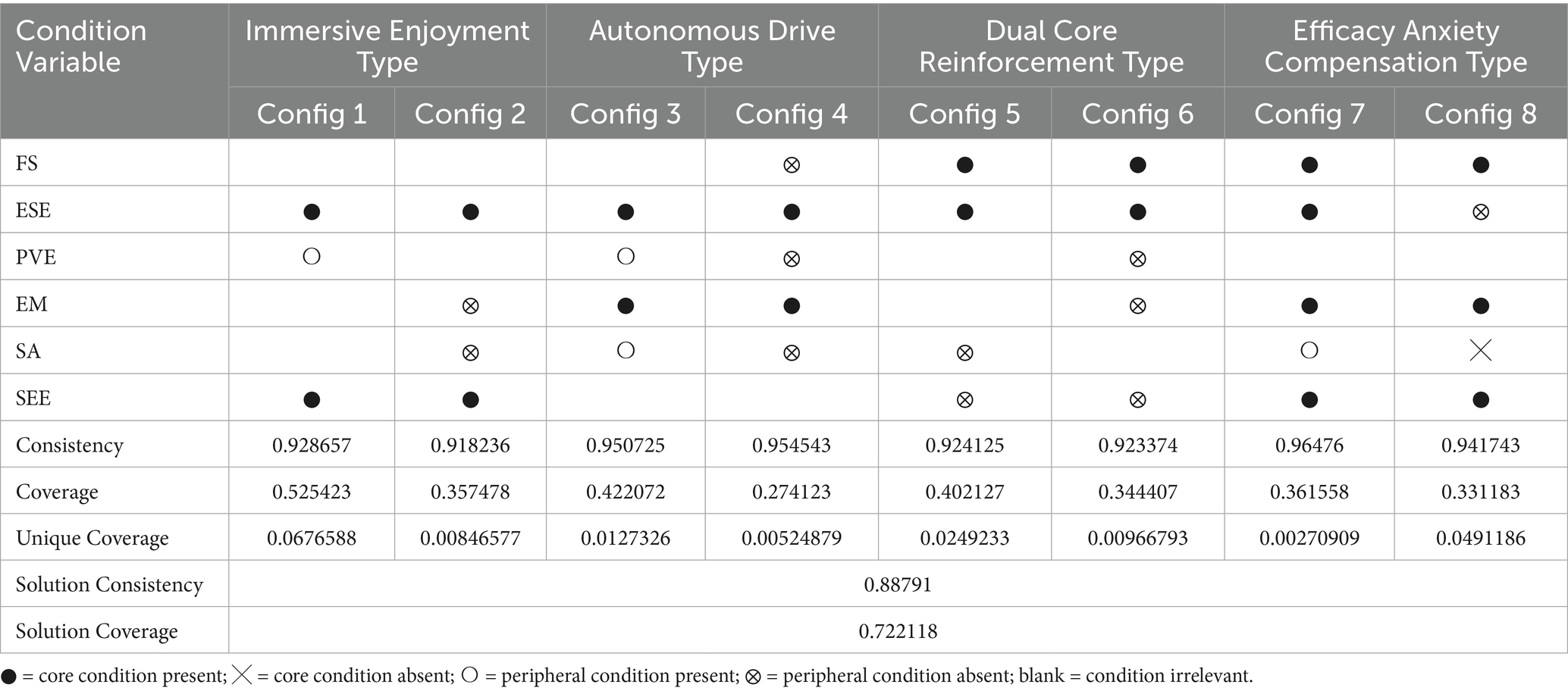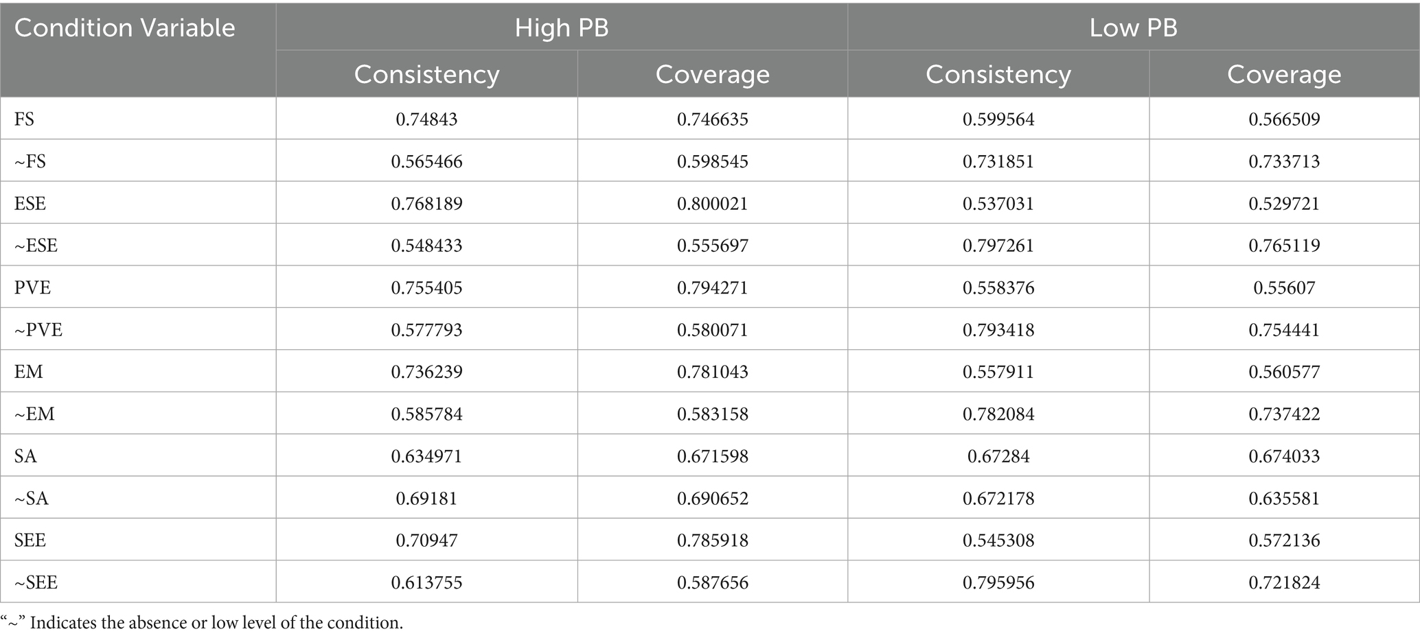 Necessary condition analysis, assessed through consistency indices, represents a preliminary step in configurational analysis. Following established criteria (28), we considered condition variables necessary only if their consistency exceeded 0.9. As shown in Table 4, none of the individual condition variables—FS, ESE, PVE, EM, SA, or SEE—met this threshold for either high or low PB levels.