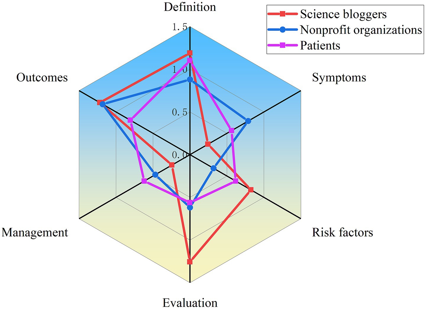 Among Non-medical professionals, videos produced by science bloggers provided greater informational depth regarding definitions, evaluations, and outcomes. In contrast, content created by patients and nonprofit organizations prioritized symptom-focused narratives and management strategies. This divergence likely stems from the fact that patients and nonprofit organizations concentrate more on the symptoms accompanying abnormal bowel sounds – such as abdominal distension, pain, and diarrhea enabling their content to resonate more readily with viewers through shared experiential perspectives (36–38).