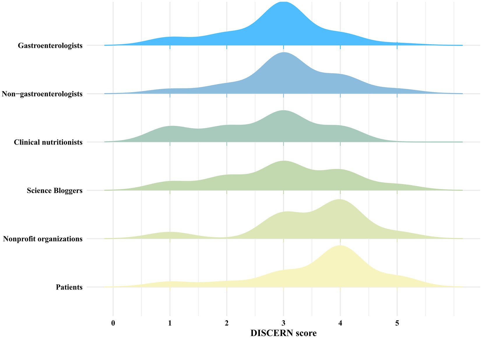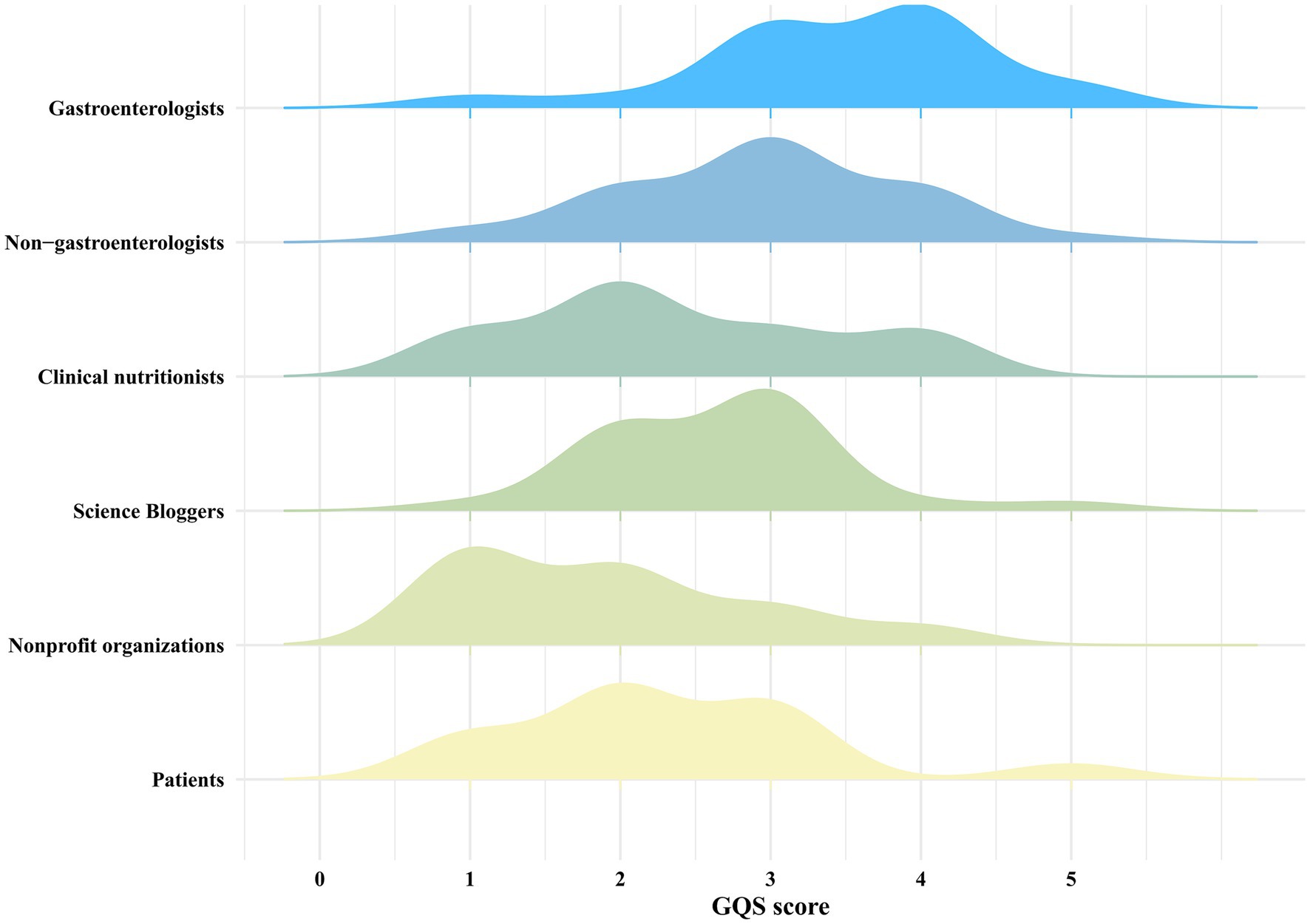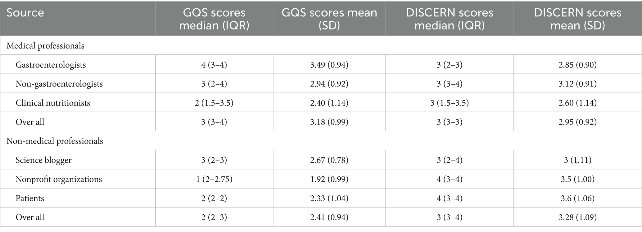 We first use GQS to assess the overall quality of each video. As shown in Table 3, videos created by medical professionals scored higher on the GQS than those from non-medical professionals (z = 4.448, p < 0.001). Further analysis indicated that videos by gastroenterologists had higher quality scores than those from others in medical professionals (χ2 = 35.462, p < 0.001) (Figure 5). And videos by Science Bloggers had higher quality scores than those from others in non-medical professionals (χ2 = 32.111, p < 0.001) (Figure 5). The DISCERN was used to assess video reliability, consistent with the GQS findings, reliability scores for videos by medical professionals were higher than those by non-medical professionals (z = 2.209, p < 0.05). Additional analysis revealed that videos by gastroenterologists had higher quality scores than those from others in medical professionals (χ2 = 60.974, p < 0.001). As with GQS, videos by Science Bloggers had higher scores than those from others in non-medical professionals (χ2 = 21.556, p < 0.001) (Figure 6).