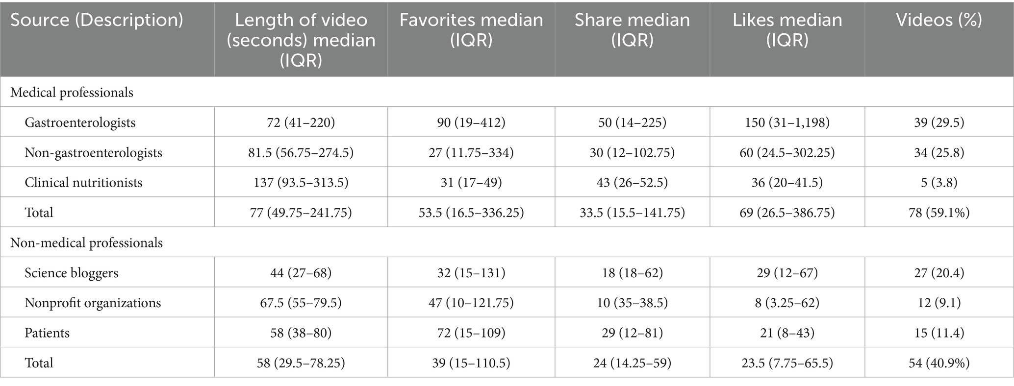 As shown in Table 1, 78 of the 132 videos were shared by medical professionals (59.1%), whereas 54 were shared by non–medical professionals (40.9%). In the medical professionals, the proportion of videos uploaded by gastroenterologists (n = 39, 29.5%) and non-gastroenterologists (n = 34, 25.8%) is roughly the same, with the Clinical nutritionists uploading the least (n = 5, 3.8%). In contrast, in the non-medical professionals, science bloggers contribute the most (n = 27, 10.4%), followed by patients (n = 15, 11.4%), and finally nonprofit organizations (n = 12, 9.1%). Across all included videos, we found that videos uploaded by Medical professionals had a longer duration (median: 77, IQR49.75–241.75), higher favorites (median: 53.5, IQR16.5–336.25), more shares (median: 33.5, IQR15.5–141.75) and even more likes (median: 69, IQR26.5–386.75). Surprisingly, we found that videos uploaded by clinical nutritionists in medical professionals had a longer duration (median: 137, IQR 93.5–313.5) but received the least likes (median: 36, IQR 20–41.5) than videos from others in medical professionals.