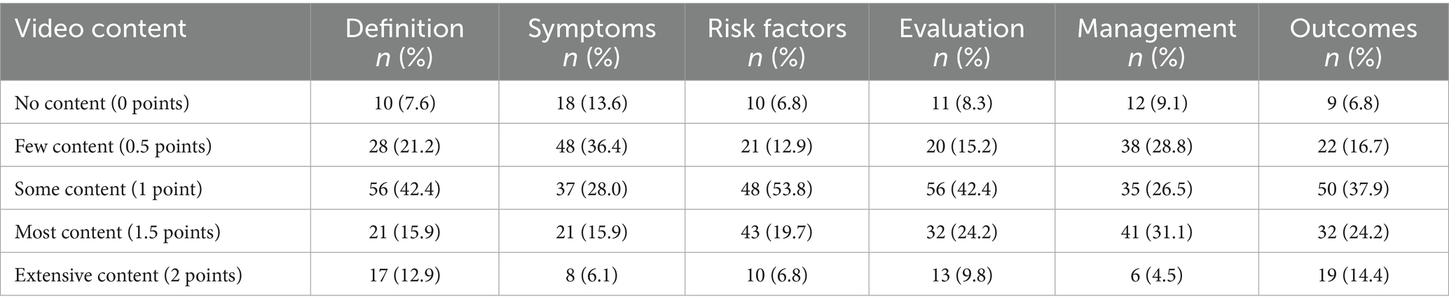 The completeness, quality and reliability of the videos were scored using adopted grading systems similar to those used in other video evaluation studies to divide the video content into six key categories: definition, epidemiology, risk factors, outcomes, diagnosis and treatment. The quality of the content was evaluated by two raters who scored how adequately each video addressed each type of content on a 5-grade Likert scale: 0 points (no content), 0.5 points (little content), 1 point (some content), 1.5 points (more content) and 2 points (extensive content).