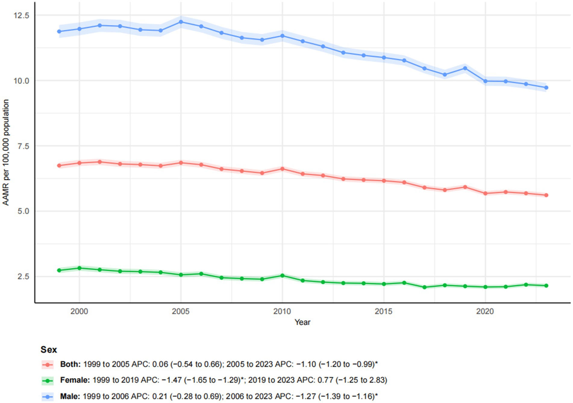 Figure 1. Trends in esophageal cancer-related age-adjusted mortality rates stratified by sex, 1999–2023. Asterisks indicate statistical significance at p-value < 0.05 (two-sided).