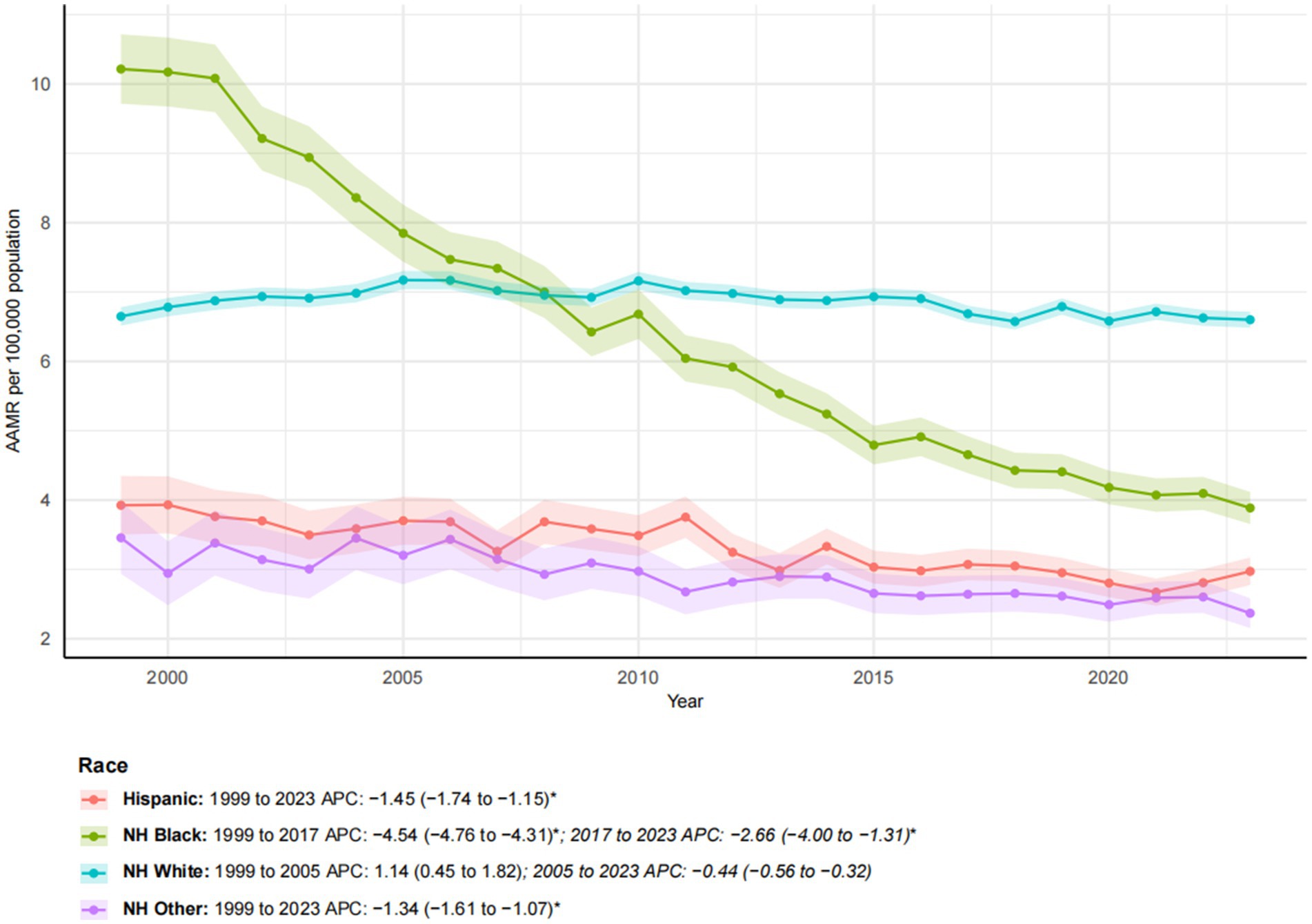 Figure 2. Trends in esophageal cancer-related age-adjusted mortality rates stratified by race, 1999–2023. Asterisks indicate statistical significance at p-value < 0.05 (two-sided).