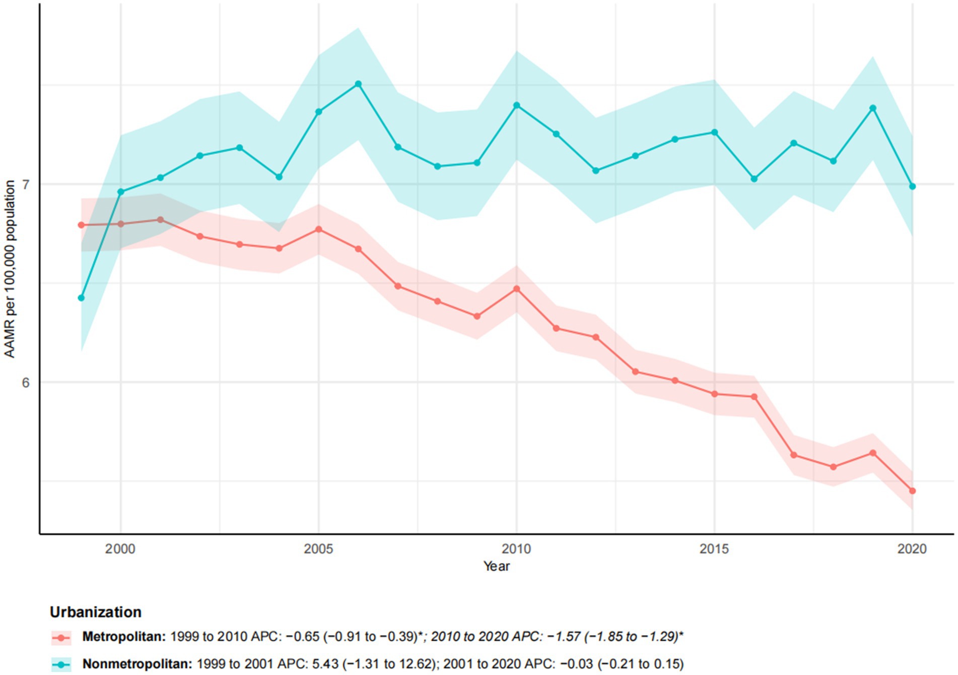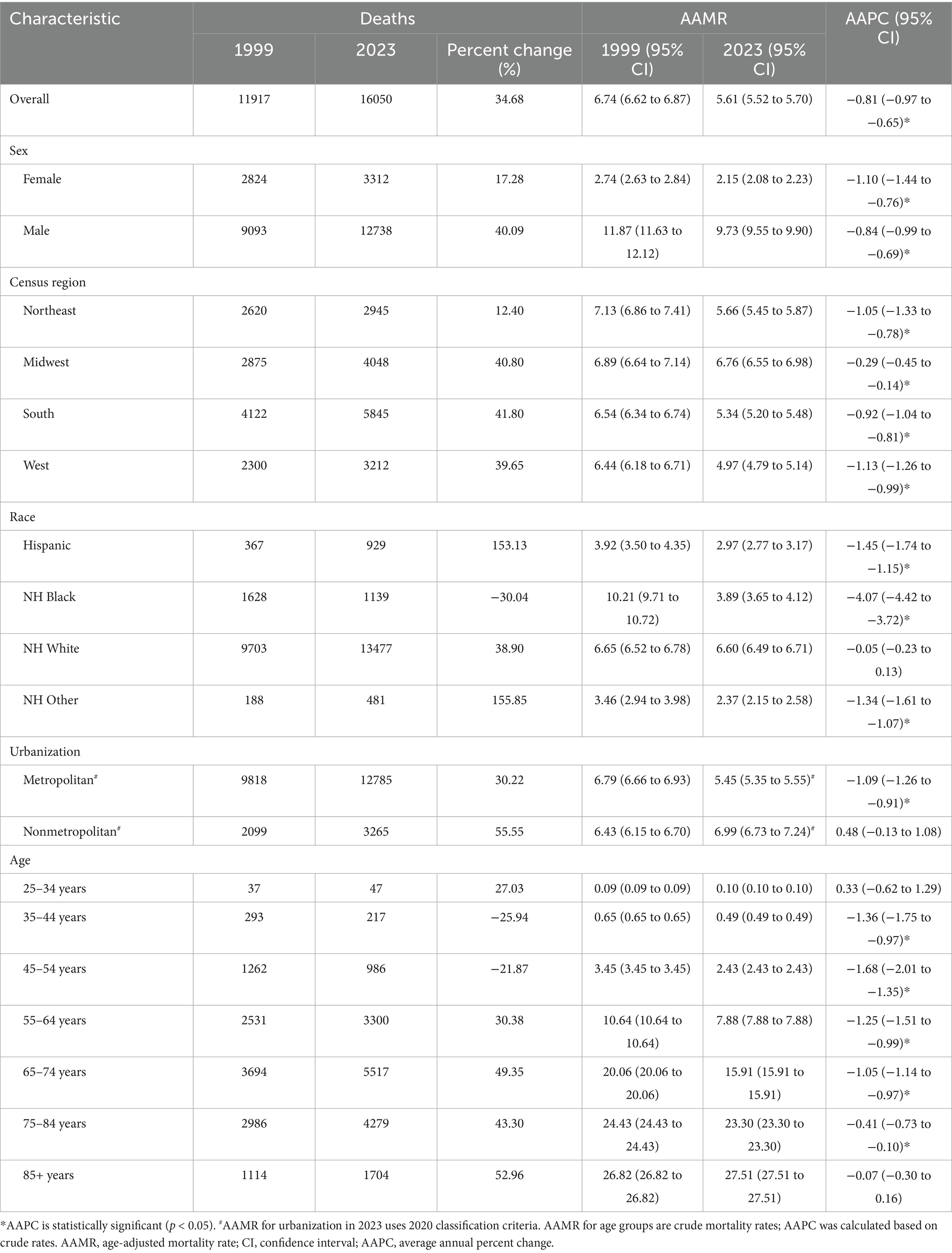 The dataset comprises information on population size, year, and the place of death, as well as demographic characteristics such as age, sex, and ethnicity. Ethnicity were classified according to the bridged-race estimates. Individuals of Hispanic or Latino origin were included as a separate category encompassing all ethnic backgrounds. NH groups were defined as mutually exclusive and included the following: white, Black or African American, American Indian or Alaska Native (AI/AN), and Asian or Pacific Islander (API). The “NH other” category, as provided by CDC WONDER, consists of individuals not otherwise classified into the preceding NH groups. Records with unknown ethnicity were excluded from ethnicity-stratified analyses. Geographic regions were defined according to the U.S. Census Bureau classifications: Northeast, Midwest, South, and West. Urban–rural status was assessed using the 2013 National Center for Health Statistics (NCHS) Urban–Rural Classification Scheme. To maintain consistency across the study period (1999–2023) and mitigate potential misclassification due to the changes in county designations over time, a fixed version of the 2013 scheme was employed. Counties were further grouped into three categories: large central and fringe metropolitan (population ≥1 million), medium and small metropolitan (population 50,000–999,999), and non-metropolitan (population < 50,000). Mortality data were obtained from death certificates and were consistent with prior studies utilizing the CDC WONDER database. Population estimates for rate calculations followed U.S. Census Bureau definitions of age, ethnicity, and geographic region (9).