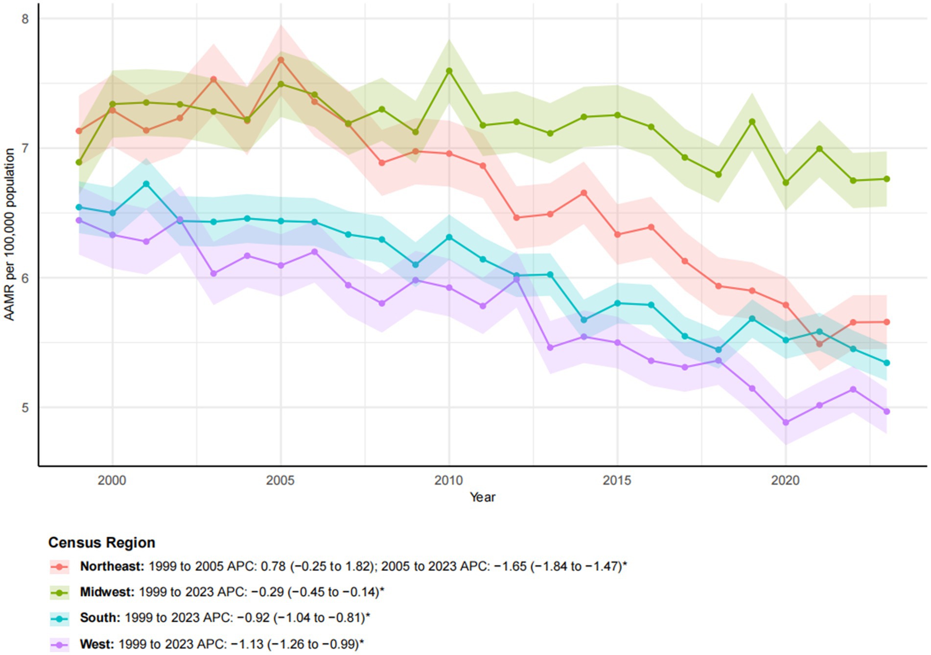 Figure 4. Trends in esophageal cancer-related age-adjusted mortality rates stratified by census region, 1999–2023. Asterisks indicate statistical significance at p-value < 0.05 (two-sided).