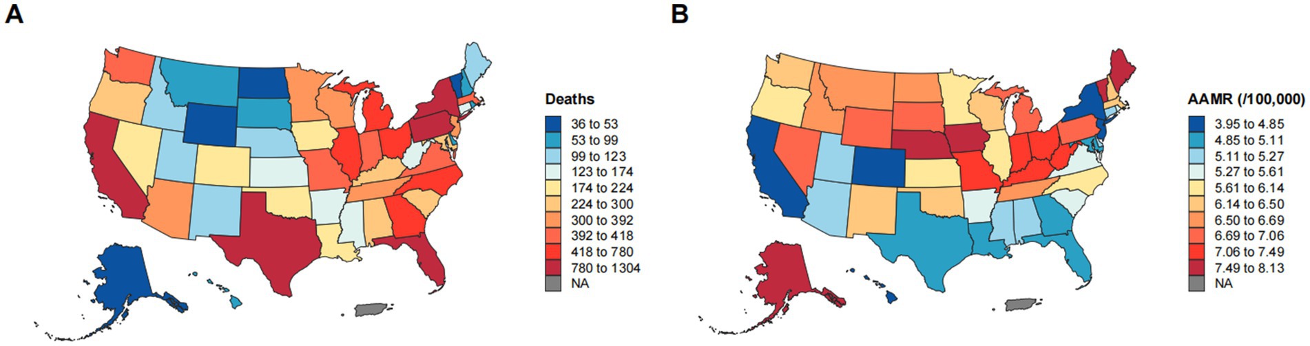 Figure 5. Geographic disparities in esophageal cancer mortality. (A) Geographic distribution of the number of deaths from esophageal cancer. (B) Geographic distribution of AAMR per 100,000 population for esophageal cancer.
