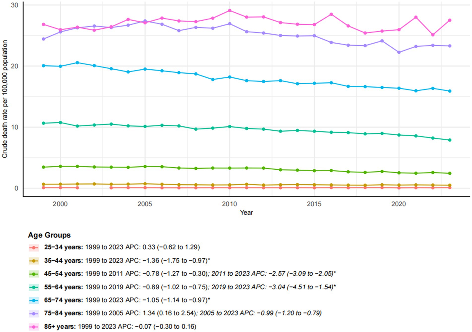 Temporal trends in mortality rates were analyzed using the Joinpoint Regression Program (Version 5.4.0.0; National Cancer Institute, USA). Analyses were configured, with a maximum of five joinpoints permitted. The model assumed uncorrelated errors, and a permutation test was applied with 4,499 permutations and an overall alpha level of 0.05 to determine the optimal number of joinpoints. The annual percent change (APC) and average annual percent change (AAPC) were reported along with their 95% confidence intervals (CI). A p-value ≤ 0.05 was considered statistically significant. Given the exploratory and descriptive nature of this epidemiological study, which aimed to identify potential trends across key demographic strata, consistent with common practice in analogous surveillance studies utilizing joinpoint regression, we did not adjust for multiple comparisons. The primary objective was to characterize trends within each prespecified subgroup, rather than testing a single overarching hypothesis. This analytical approach is consistent with prior studies that used CDC WONDER data (11).