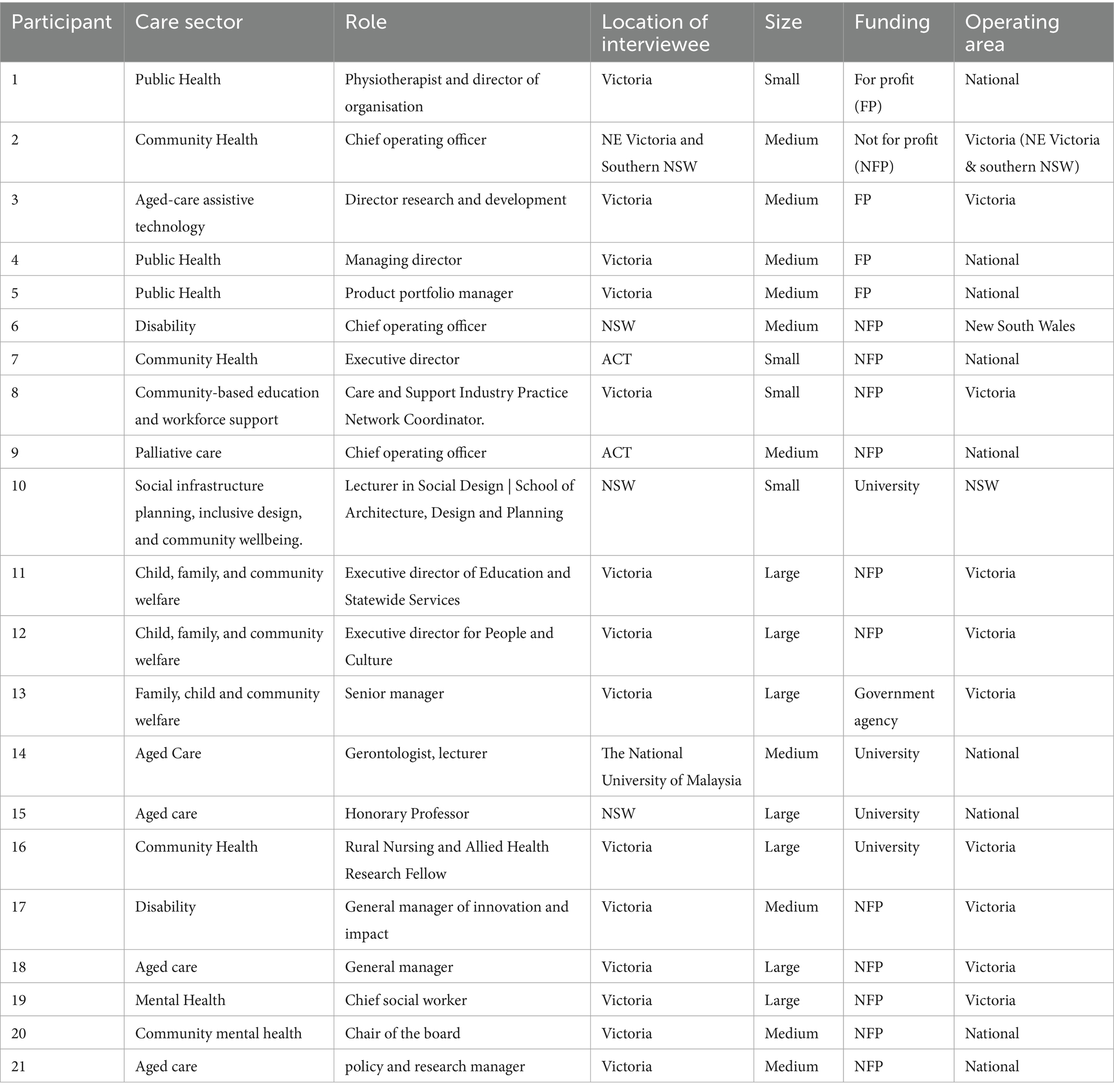 The study was conducted online with participants located across Australia (see Table 1), including both rural and metropolitan areas. Participating organisations represented a mix of small, medium and large aged-care providers across public, private and not-for-profit sectors, offering both residential and community services. Participants were all members of the CECN or who had expressed an interest in the work being carried out by CERI. Eligible participants were leaders or decision makers in a wide range of sectors operating in the care economy. These included aged care, disability support, childcare, family services and community health. The interviews focused on the participants’ research priorities, ideas for improving collaboration, and the kinds of support they expect from the network. To gain a clearer understanding of the research priorities, collaboration needs, and expectations of key stakeholders in the care economy, email invitations were sent out to a variety of leaders and key role players across the care economy who had expressed an interest in the work conducted by CERI. Of the 87 original invitations sent, twenty-one participants were interviewed and were able to provide insights into the research and collaboration needs of their respective organisations. Recruitment was conducted via email and the interviews were conducted via Zoom. Following the interview, the participants were given the opportunity to review and edit their transcripts prior to the thematic analysis.