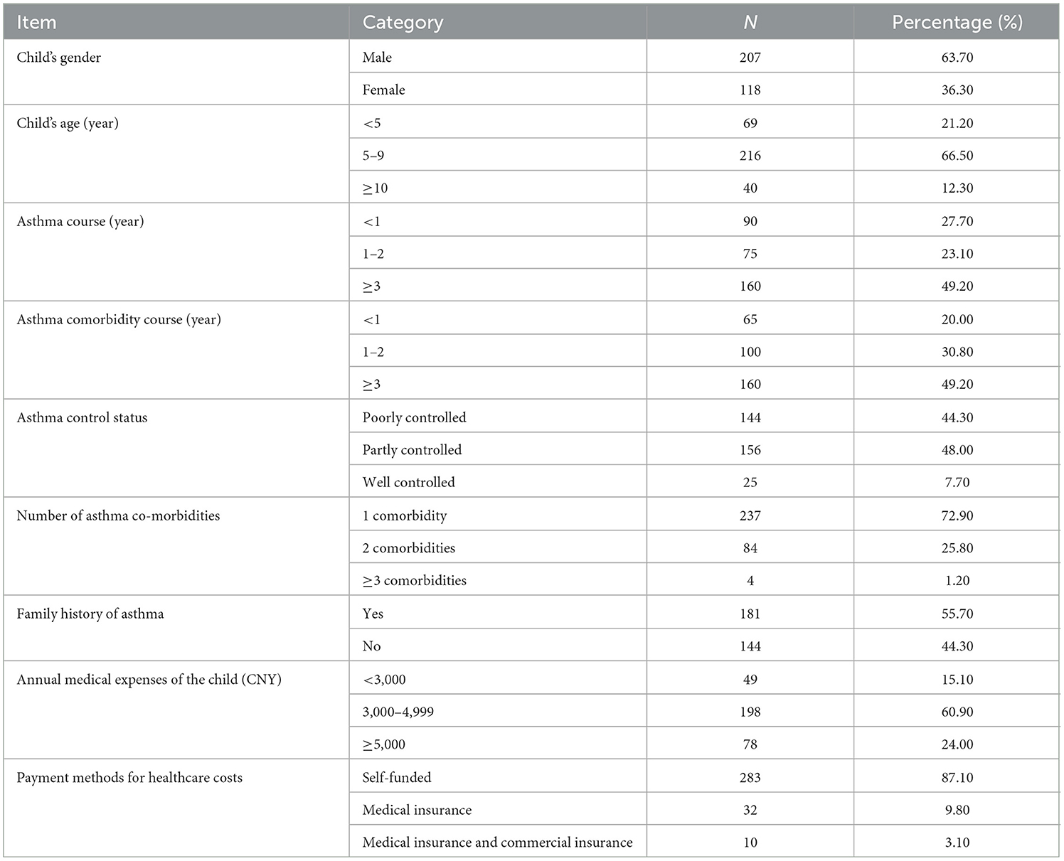 Among the 325 parents of children with asthma comorbidities, 113 were male (34.80%) and 212 were female (65.20%), with a higher proportion of females. The average age of the parents was (34.17 ± 3.57) years. In terms of educational level, 176 (54.20%) had a college education, 80 (24.60%) had a high school or technical secondary school education, 45 (13.80%) had a Junior high school or below, and 24 (7.40%) had a master's degree or above. Among the employment statuses, 234 parents (72.00%) were employed full-time, 24 parents (7.40%) were employed part-time, and 67 (20.60%) were in other employment statuses. See Table 2 for details.