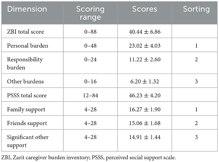 The Zarit Caregiver Burden Inventory (ZBI), developed by Zarit et al. (17), is used to assess the level of burden experienced by caregivers. The ZBI questionnaire used in this study was translated and revised by Chinese scholar Wang et al. (30). The Chinese version of the questionnaire consists of 22 items, divided into two dimensions: personal burden and responsibility burden. Specifically, it includes 12 items related to personal burden (Items 1, 4, 5, 8, 9, 14, 16–21) and 6 items addressing other forms of burden (Items 2, 3, 6, 11–13). Items 7, 10, and 15 are not categorized under any dimension, while Item 22 serves as an overall evaluation of the caregiver's perceived burden. The questionnaire uses a 5-point Likert scale, with responses ranging from 0 to 4, corresponding to “never”, “rarely”, “sometimes”, “often”, and “always” respectively. Total scores range from 0 to 88, with higher scores indicating greater caregiver burden. Scores of 0 to 19 indicate no burden, 20 to 39 indicate mild burden, 40 to 59 indicate moderate burden, and scores above 60 indicate severe burden. The Cronbach's alpha coefficient of the original scale is 0.870, and in the present study, the Cronbach's alpha coefficient for the scale was 0.832.
