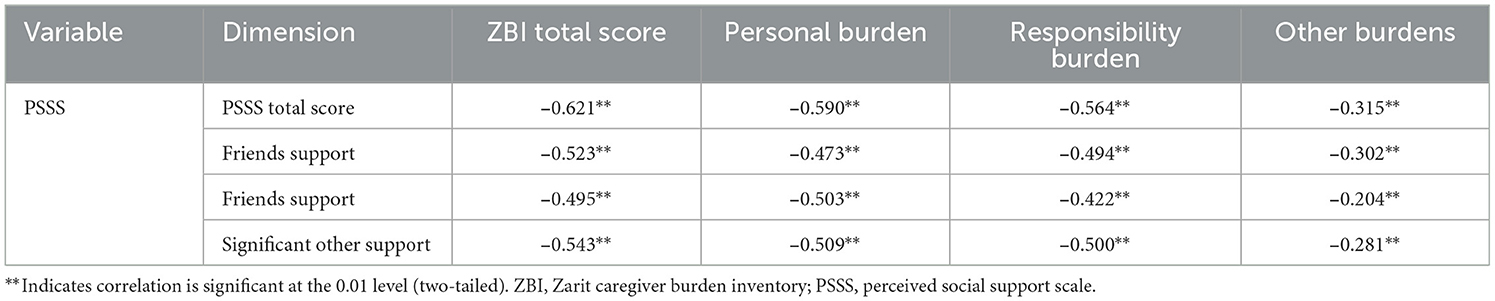Pearson correlation analysis revealed significant negative correlations between caregiver burden (total and dimension scores) and perceived social support (total and dimension scores) (all P < 0.01). Specifically, a strong negative correlation was found between the total scores of caregiver burden and perceived social support (r = −0.621, P < 0.01). See Table 4 for details.