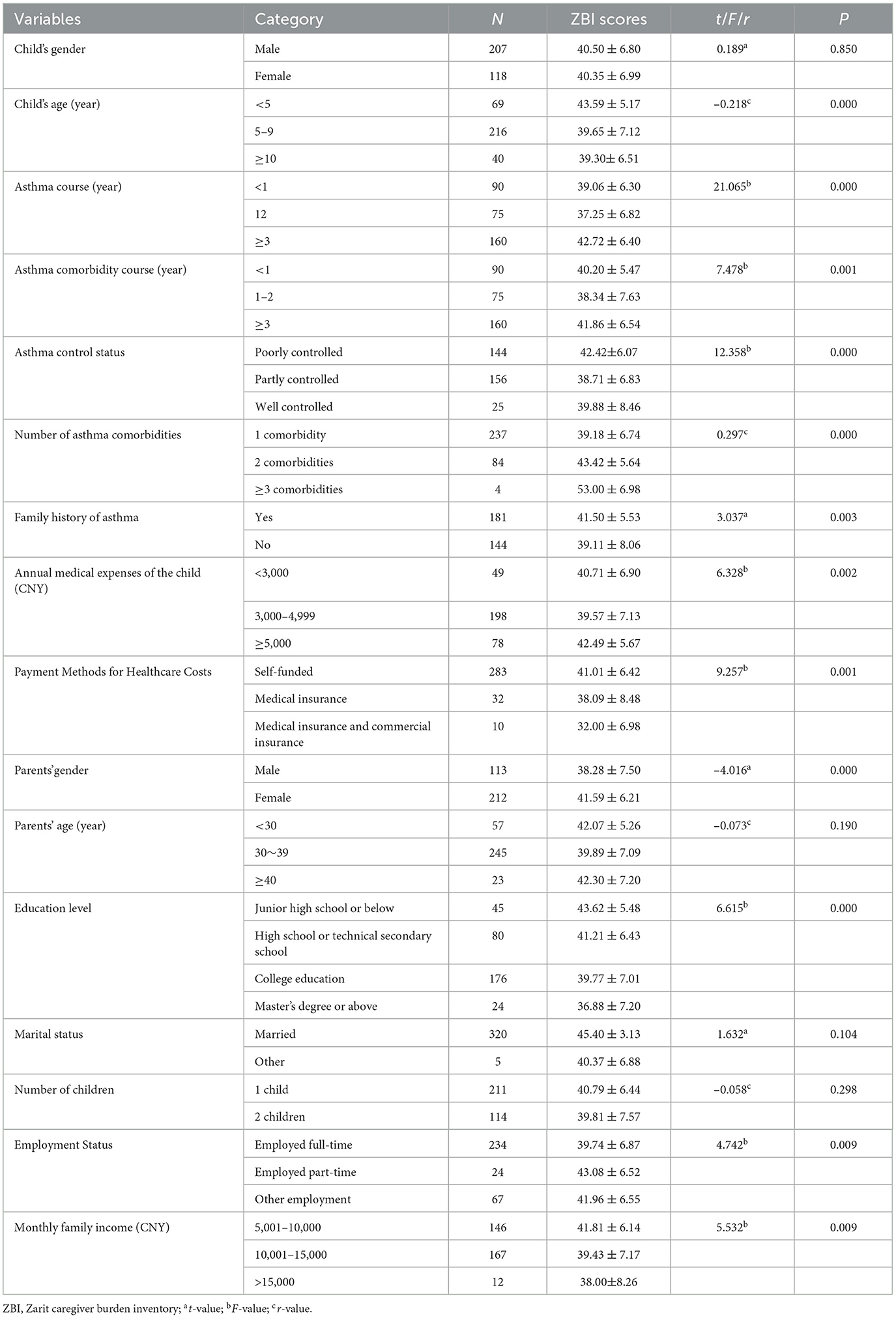 Table 5. Univariate analysis of caregiver burden among parents of children with asthma comorbidities (N = 325).