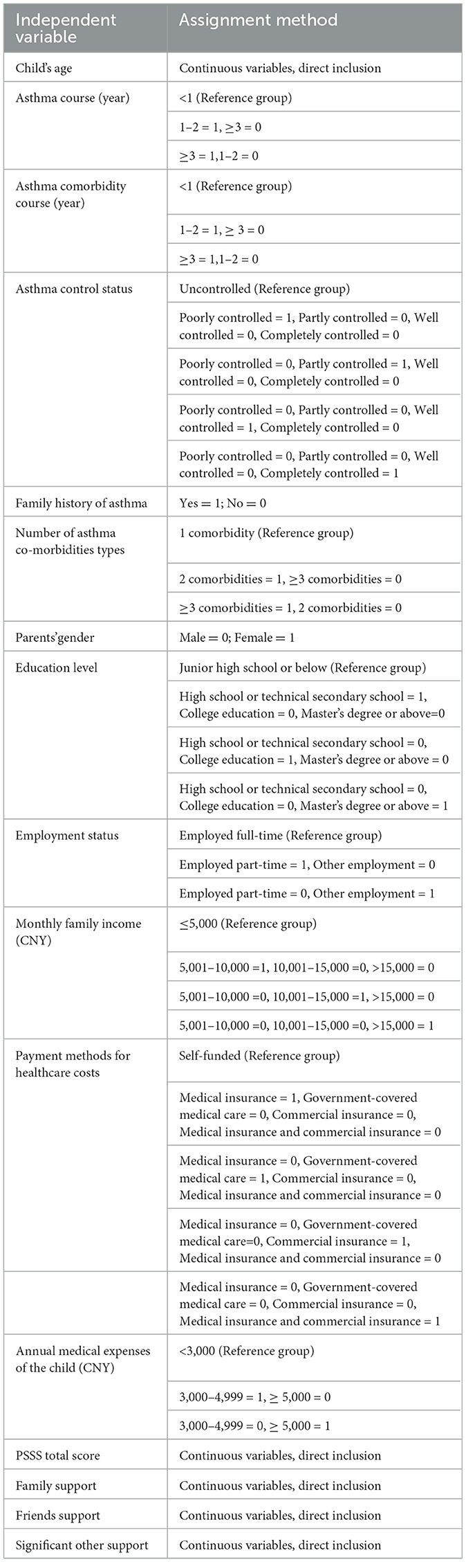 Multiple linear regression analysis was performed with the total caregiver burden score as the dependent variable. The independent variables were those identified through univariate analysis and Pearson correlation analysis. The analysis revealed that perceived social support, the child's age, asthma course, number of comorbidities, payment methods of healthcare costs, asthma comorbidity course, employment status, and asthma control status were significantly associated with caregiver burden. These factors collectively explained 55.2% of the variance in caregiver burden (R2 = 0.552). The assignments of the independent variables are shown in Table 6, and the results of the multiple linear regression analysis are shown in Table 7.