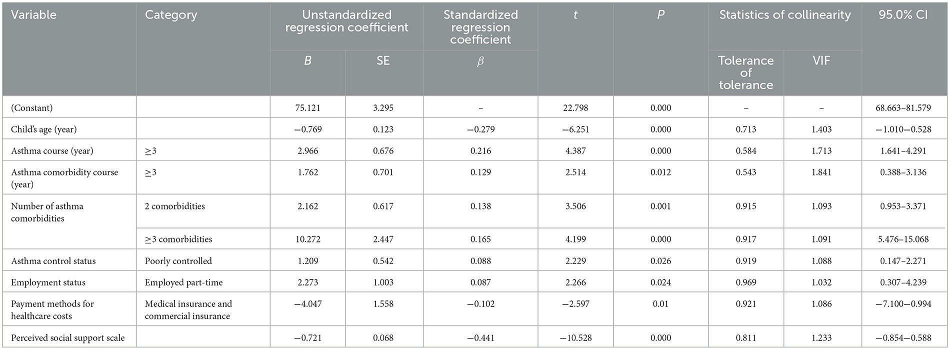 Data from the questionnaires were entered using Microsoft Excel 2019 to establish and organize the database. Statistical analyses were performed with SPSS 25.0 software. During the data cleaning phase, following an overall assessment of data quality, missing values were addressed using listwise deletion. Only complete cases without any missing values were included in the analysis to ensure both the sample size and reliability of subsequent analyses. Qualitative data are presented as frequencies and percentages. For quantitative data, the descriptive approach was determined based on their distribution. The normality of continuous variables was assessed using the Shapiro-Wilk test. Quantitative data that were normally or approximately normally distributed are described as means and standard deviations, while those not meeting the normality assumption are reported as medians and interquartile ranges. Independent samples t-tests and one-way analysis of variance were used to examine differences in caregiver burden scores among parents of children with asthma comorbidities based on demographic characteristics of both the parents and the children. Pearson correlation analysis was conducted to explore the correlation between parental caregiver burden and perceived social support, as well as the relationships between numerical demographic variables and caregiver burden. Multiple linear regression analysis was employed to identify factors influencing the caregiver burden among parents of children with asthma comorbidities. Nominal variables were converted into dummy variables before being entered into the regression model. Multicollinearity among the independent variables was assessed using the variance inflation factor (VIF) and tolerance to ensure the stability and accuracy of the regression model. A VIF < 10 and a tolerance > 0.1 indicated the absence of severe multicollinearity, allowing for the regression analysis to proceed. If VIF ≥10 or tolerance ≤ 0.1, remedial measures such as removing redundant variables or merging variables were applied before further analysis. The independence of residuals was verified using the Durbin-Watson test. To quantify the magnitude of the associations, the effect size (standardized coefficient β) along with its 95% confidence interval (CI) are reported. A P-value < 0.05 was considered statistically significant.
