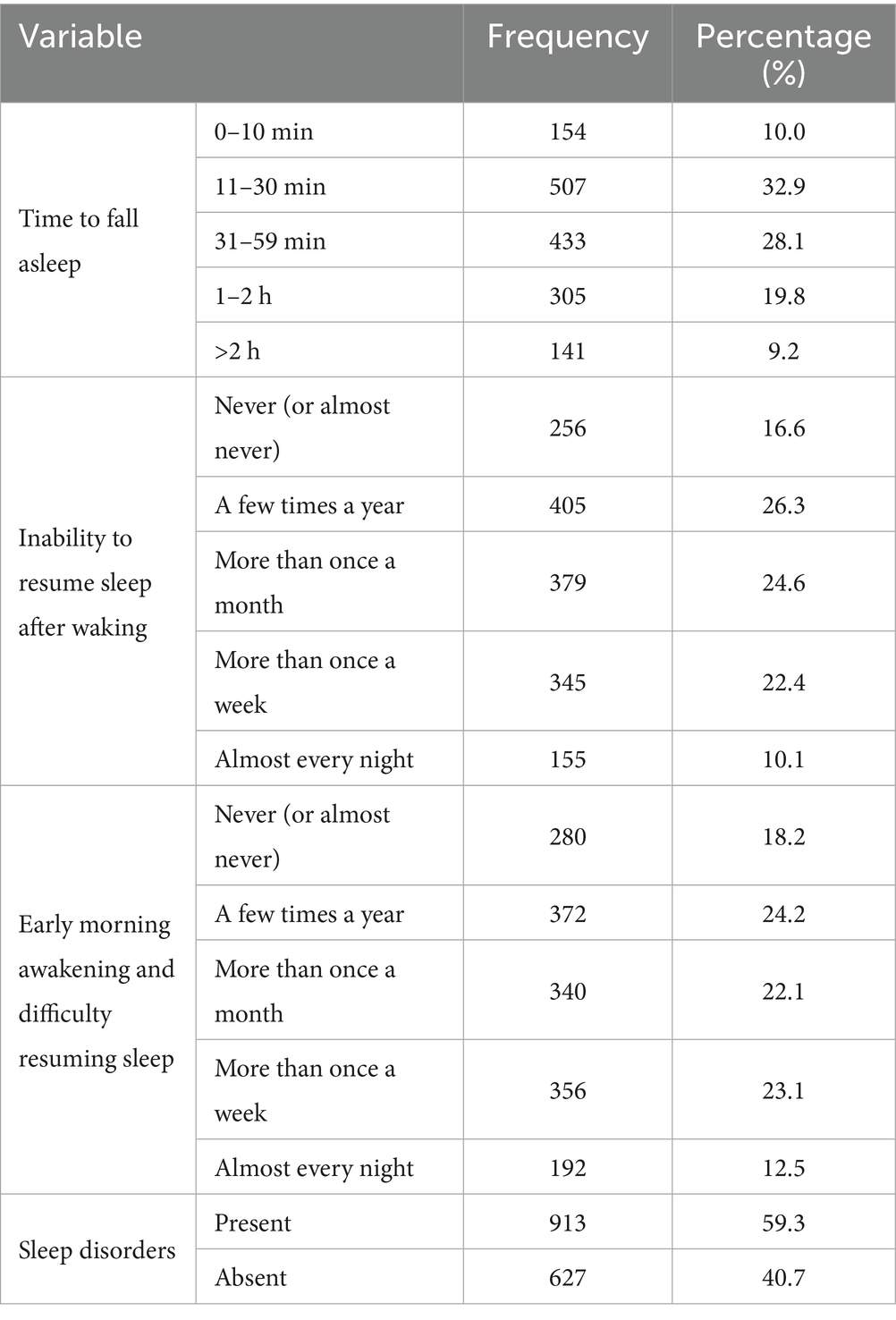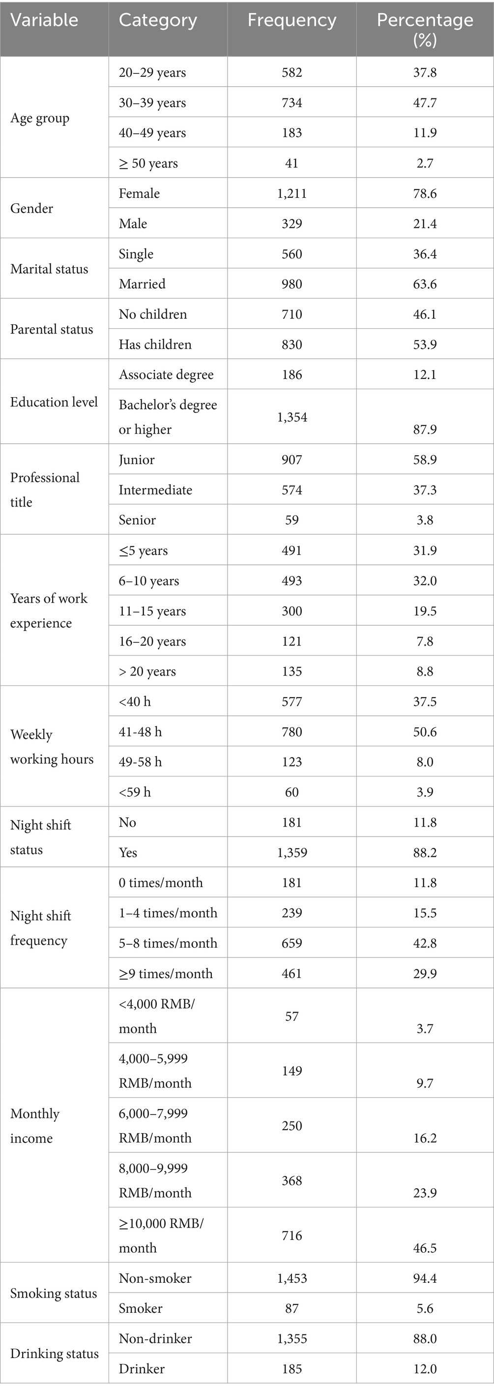 During the study period, a total of 1,551 questionnaires were collected. After excluding 11 questionnaires with identical responses, 1,540 were included in the final analysis. The participants were recruited from seven geographical regions of China. The regional distribution was as follows: North China (9%), Northeast China (15.3%), East China (21.6%), Central China (9%), South China (8.2%), Southwest China (16.9%), and Northwest China (19.7%). The basic characteristics of the participants were as follows: 1,211 were female, accounting for 78.6%; 1,354 had an education level of a bachelor’s degree or higher, representing 87.9%; 960 worked more than 40 h per week, accounting for 62.5%; and 1,359 had night shifts, representing 88.2%. See Table 2 for details.