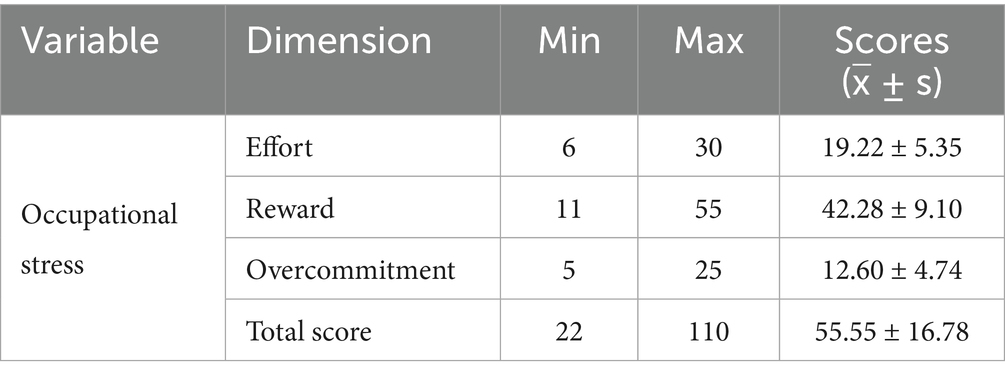 The effort-reward imbalance questionnaire, developed by the German scholar Siegrist and adapted into Chinese version by scholar Dai (11), was used to assess occupational stress levels among emergency nurses. This questionnaire comprises 6 items on effort, 11 items on reward, and 5 items on overcommitment, with each item rated on a five-point Likert scale from 1 to 5. Higher scores indicate greater levels of occupational stress. In this study, the Cronbach’s α coefficient for this scalescale was 0.88, three dimensions are 0.894, 0.952, and 0.922, respectively.