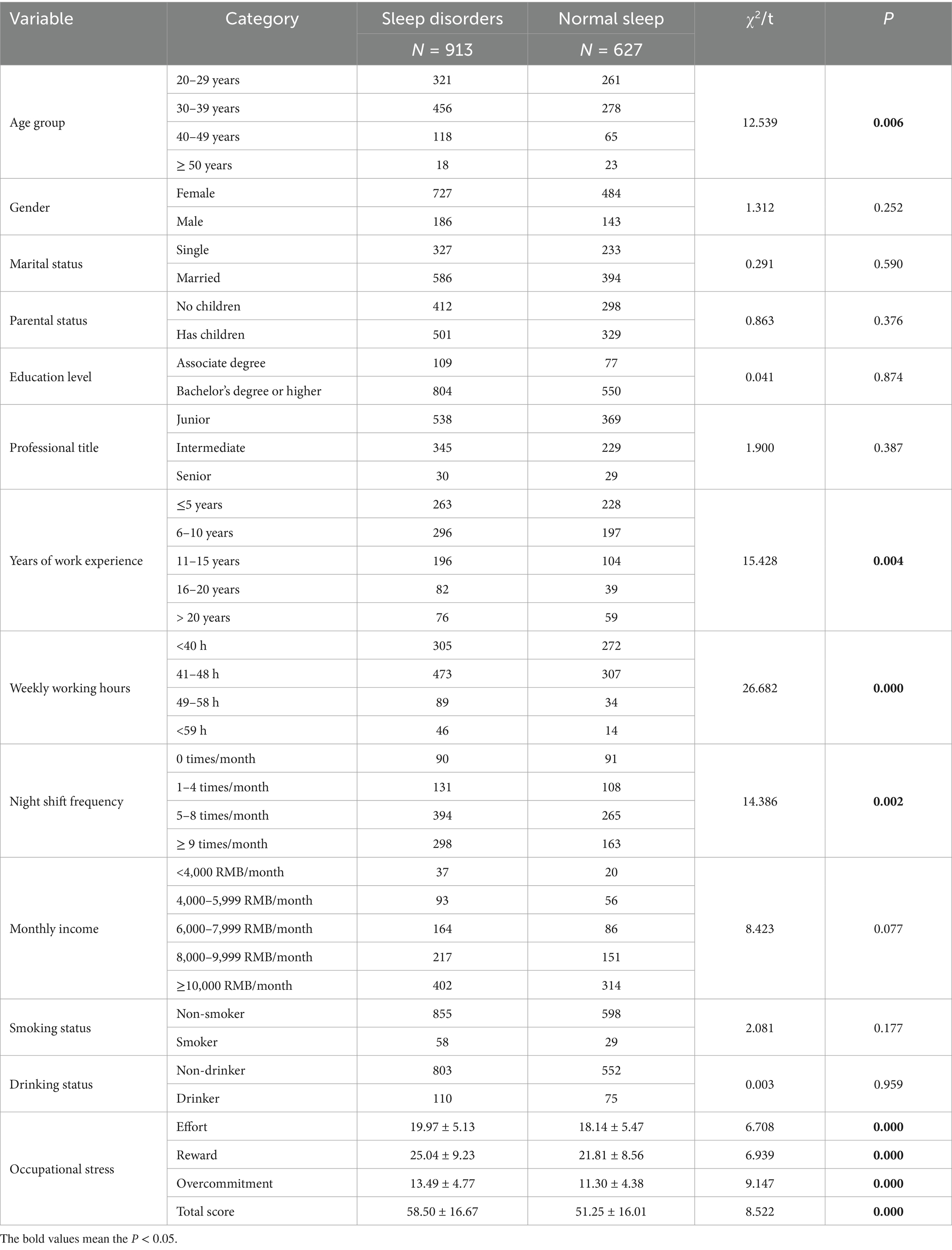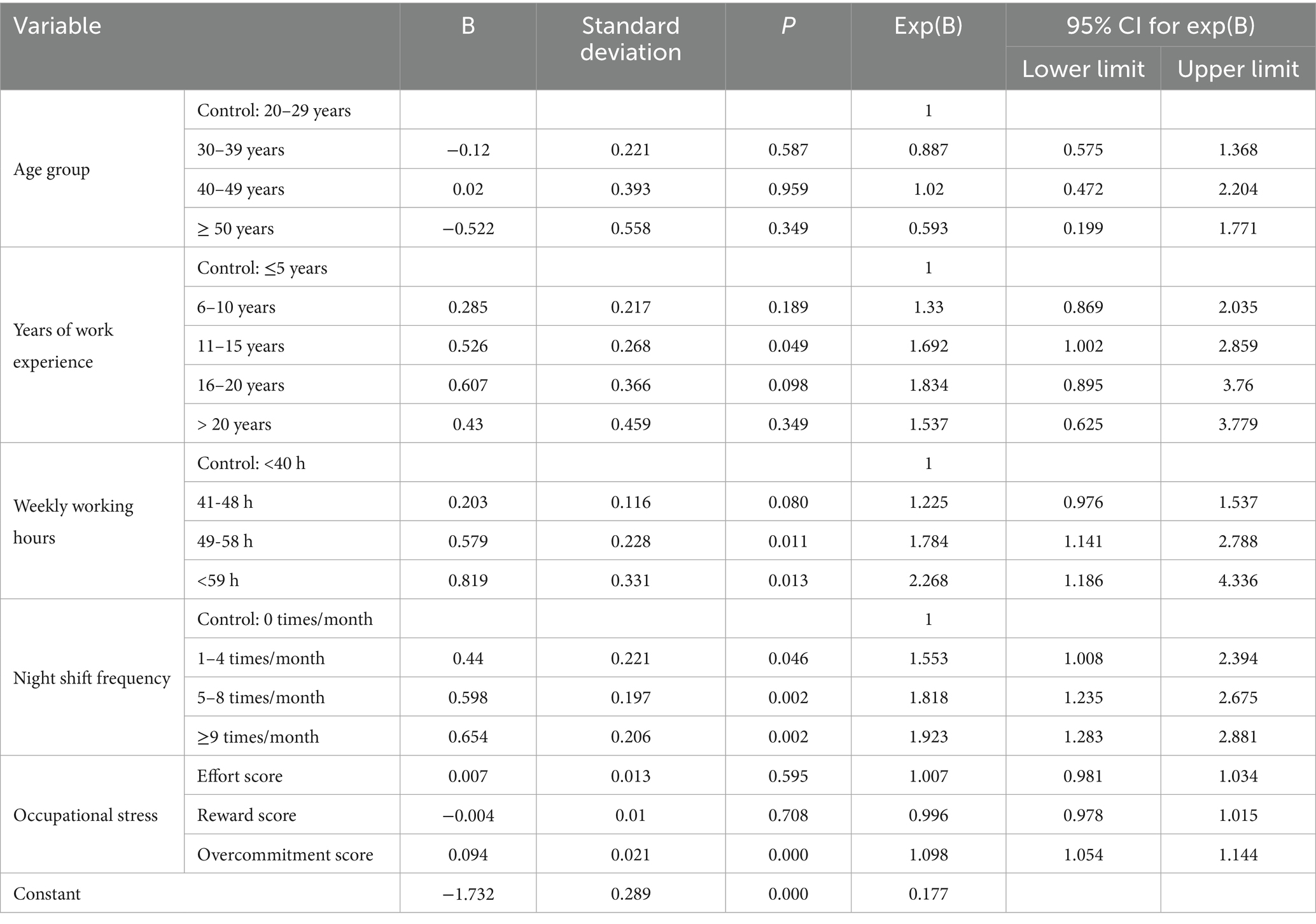 Results: A total of 1,551 questionnaires were collected. After excluding 11 invalid responses, 1,540 were analyzed. Binary logistic regression identified key risk factors for sleep disorders, including 11–15 years of work experience (OR = 1.692), weekly working hours of 49–58 h (OR = 1.784) or ≥59 h (OR = 2.268), night shift frequency, and overcommitment scores (OR = 1.098). A significant positive correlation was found between occupational stress and sleep disturbances (p < 0.05).