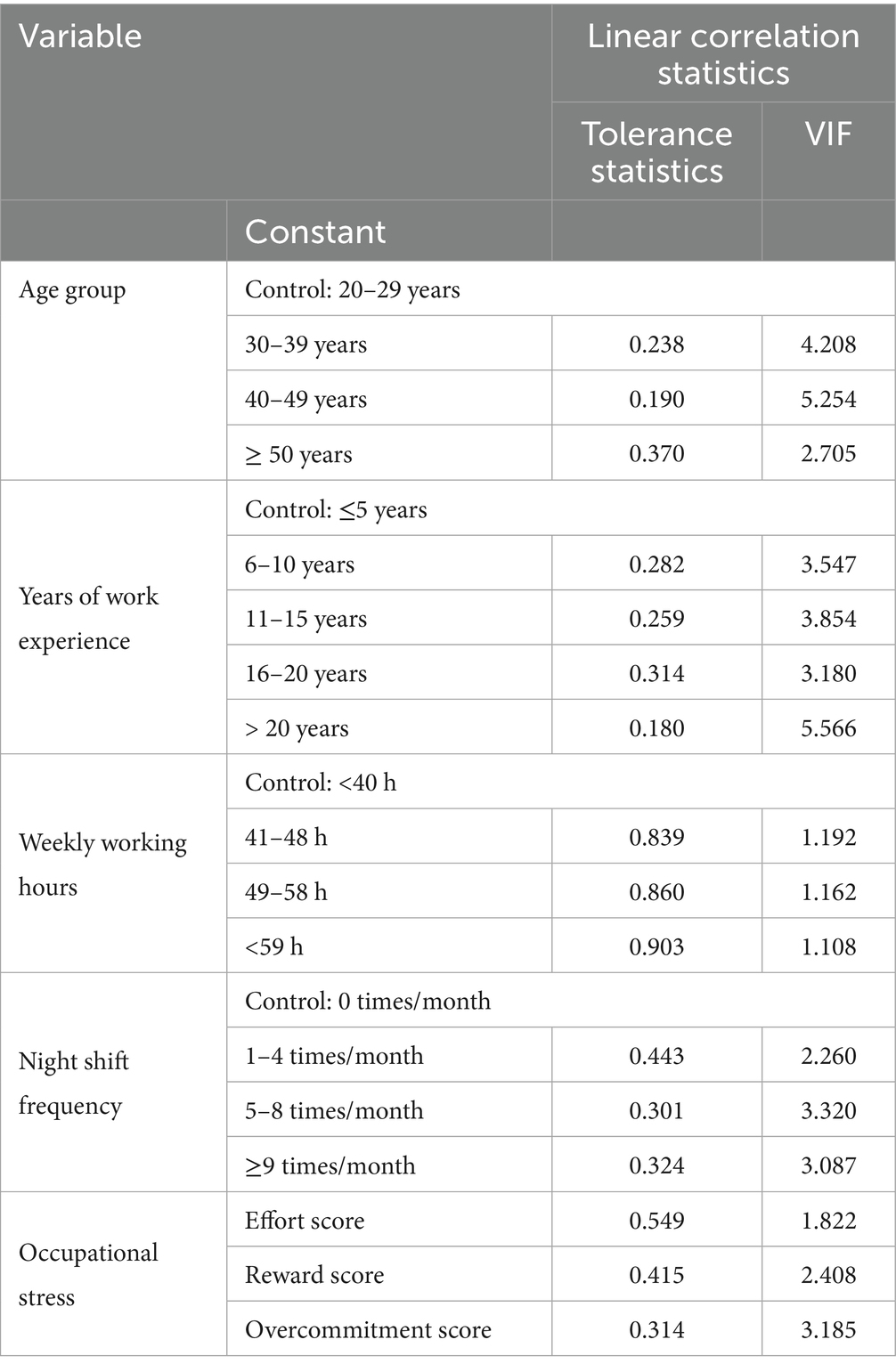 Statistical analyses were conducted using SPSS version 26.0. Descriptive statistics were performed for demographic data. Categorical variables were expressed as frequencies (n) and percentages, while continuous variables were presented as means and standard deviations. The Mann–Whitney U test was used for continuous variables, and the Chi-square test was used for categorical variables in univariate analysis. For variables with more than two categories in univariate analysis, the Chi-square test was applied with the binary sleep disorder outcome. Binary logistic regression analysis was employed to explore factors influencing sleep disorders, and Spearman’s rank correlation analysis was used to examine the relationship between occupational stress and sleep disorders. Potential confounding variables (e.g., age, gender, years of experience, night shift) were included in the binary logistic regression model to control for their effects. Multicollinearity was assessed using Variance Inflation Factor (VIF), with all values below 10 indicating no significant multicollinearity.
