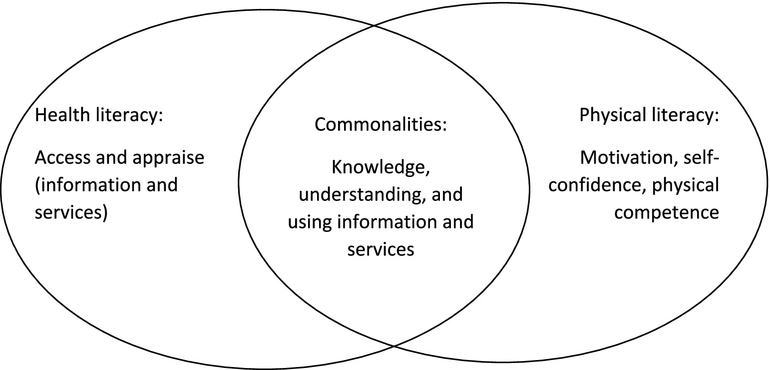 Nevertheless, both health literacy and physical literacy have a holistic approach to health and aim to empower individuals and influence their actions through both individual skills and supportive environments for health. Both physical literacy and health literacy share common ground, as they involve elements of knowledge, learning, informed decision-making, and the promotion of an active lifestyle. However, important differences between them also exist, and these distinctions influence how actions are shaped depending on which literacy framework is applied. Physical literacy, for instance, places greater emphasis on the motivational, emotional, and social dimensions of movement, which are often overlooked in health literacy approaches. Figure 1 illustrates the similarities and differences between health literacy and physical literacy definitions.