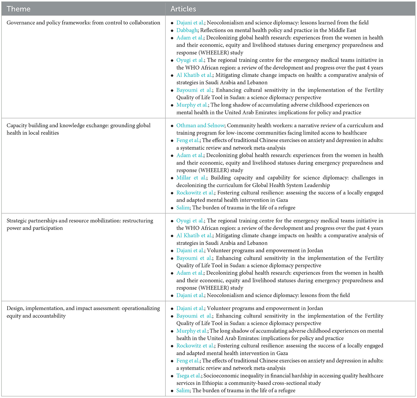 Effective science diplomacy also depends on who convenes and who controls resources. Several studies highlight models that de-center extractive funding and institutionalize shared leadership. The EMT hub in Addis Ababa represents a sustained, multi-actor training platform rooted in the region (Oyugi et al.). A comparative analysis of climate–health strategies in Saudi Arabia and Lebanon demonstrates how different political economies and funding ecosystems shape adaptation priorities (Al Khatib et al.). The Jordan “We Love Reading” initiative shows how participatory systems mapping can reveal empowerment pathways among refugees and host communities, demonstrating that community–academy partnerships can inform public policy (Dajani et al.). Research on infertility in Sudan demonstrates how adapting tools such as FertiQoL to cultural realities strengthens the case for investment in infertility care, linking measurement choices to resource mobilization (Bayoumi et al.). The perspective piece by Dajani et al. broadens this argument, calling for grassroots-driven and reflexive partnerships that resist tokenistic collaborations (Dajani et al.). Together, these contributions suggest that equitable diplomacy requires multi-year partnerships with co-leadership clauses, financing tied to community-defined metrics, and investment in platforms such as regional hubs rather than isolated projects.