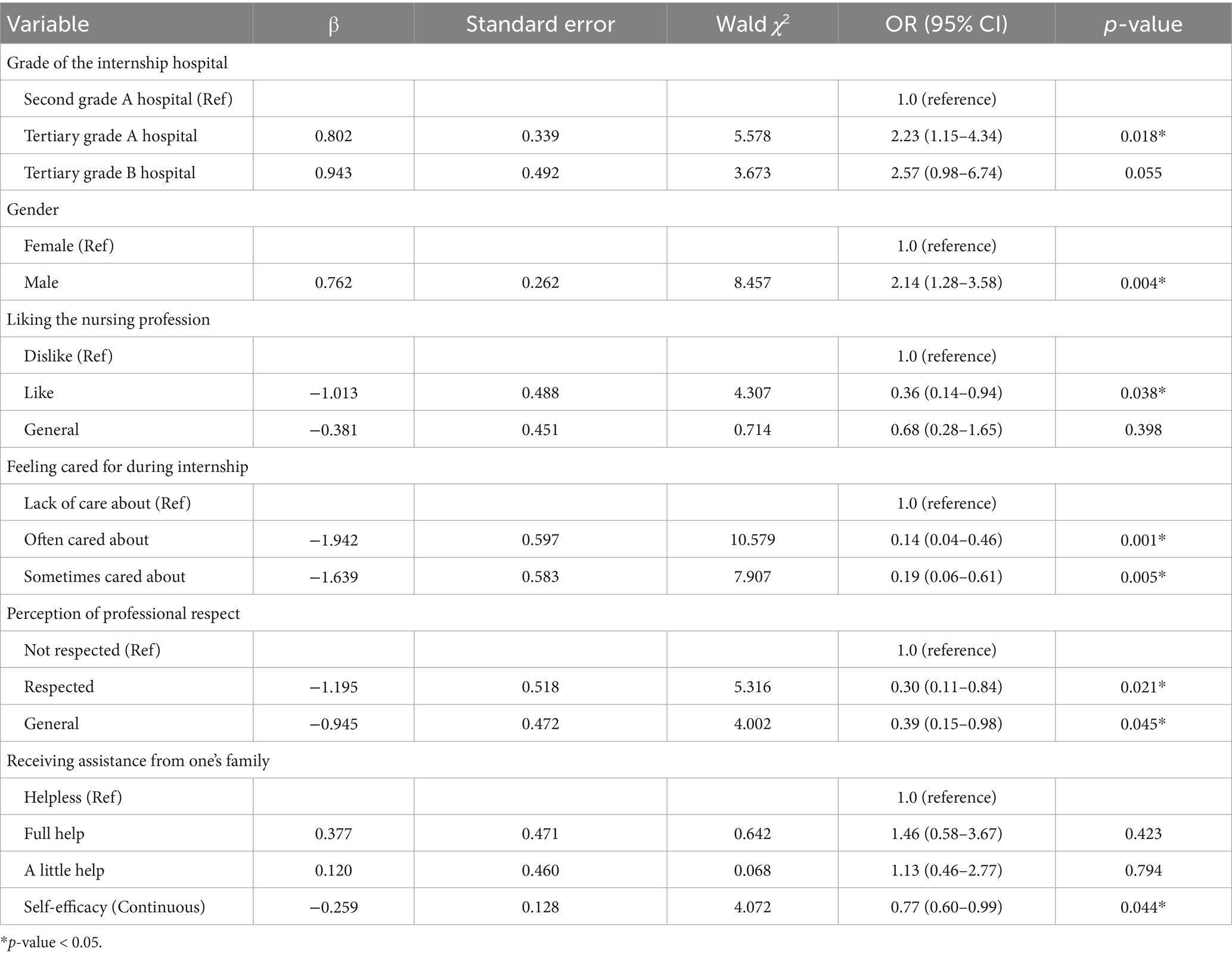 After conducting a binary logistic regression analysis on the mental health problems of vocational nursing students (Table 4), it was found that the grade of the internship hospital, gender, liking the nursing profession, feeling cared for during internship, perception of professional respect, and self-efficacy were significantly correlated with the mental health problems of higher vocational college nursing students during internship.