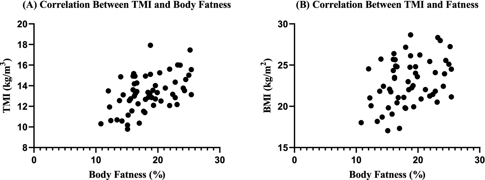 Figure 1. Bivariate correlation analysis of body fatness with BMI and TMI. Scatterplot matrix showing pairwise relationships between variables. Pearson’s correlation coefficients (r) with 95% confidence intervals. Scatterplots illustrating the correlations between body fat percentage and anthropometric indices. (A) Triponderal Mass Index (TMI, kg/m3) demonstrated a moderate positive association with body fat percentage, indicating higher TMI values correspond to greater adiposity. (B) Body Mass Index (BMI, kg/m2) also showed a positive relationship with body fat percentage, though the association appeared weaker compared to TMI. These findings support the potential utility of TMI as a more sensitive indicator of adiposity in physically active individuals.