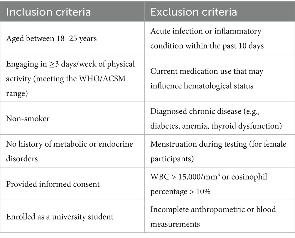 We analyzed 59 physically active students (37 men, 22 women; age 22.63 ± 2.29 years). Mean height was 171.78 ± 8.16 cm, BMI 22.78 ± 2.91 kg·m−2, and TMI 13.28 ± 1.76 kg·m−3. Mean body fat percentage was 18.45 ± 3.81%. Hemoglobin (HGB) and hematocrit (HCT) were 14.95 ± 2.03 g·dL−1 and 44.85 ± 5.04%, respectively. Inclusion criteria included engaging in physical activity on ≥3 days/week, meeting WHO/ACSM guidelines (150–300 min/week of moderate-intensity, or 75–150 min/week of vigorous-intensity aerobic activity, or an equivalent combination), non-smoking status, no chronic diseases or regular medication use, and absence of endocrine or metabolic disorders. Physical activity status was self-reported and verified by a brief activity checklist. Exclusion criteria involved menstruation, acute infection, or inflammatory disease within 10 days prior to testing; leukocyte count >15,000/mm3; or eosinophil percentage >10% following blood analysis. Participants were instructed to abstain from food and caffeine for 10 h prior to measurements.