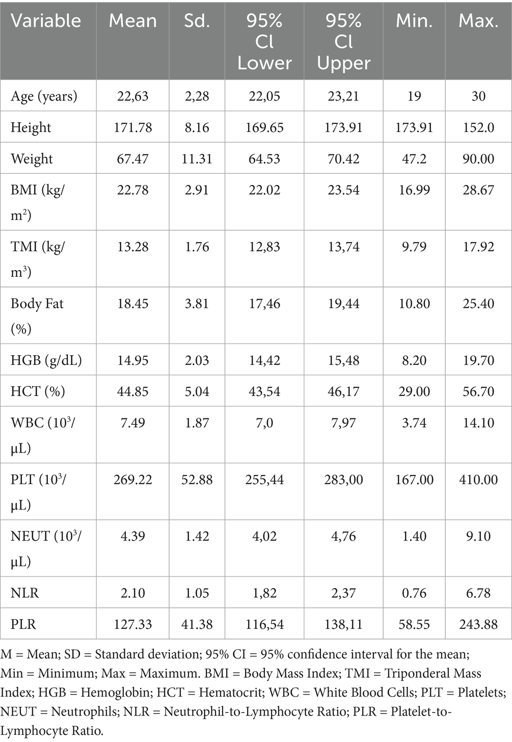 In addition to anthropometric indices, hematological parameters—such as hemoglobin (HGB), hematocrit (HCT), leukocyte differentials, and platelet indices—are important indicators of oxygen transport, inflammation, immune status, and overall physiological readiness (30–35). These markers can provide valuable insight into the metabolic and performance-related status of physically active individuals (36–38). Despite their relevance, few studies have simultaneously examined TMI, BMI, and a comprehensive hematological profile in active populations, limiting our understanding of how these indices relate to systemic health markers beyond body fat estimation alone (39–41).