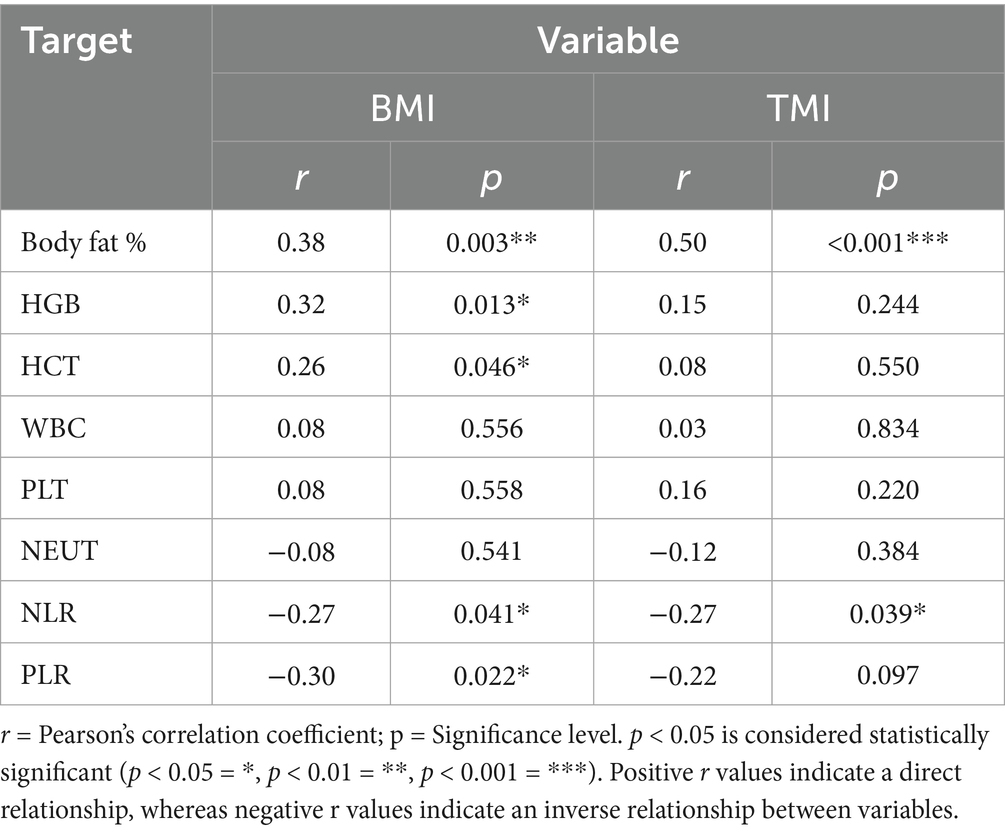 Bivariate correlation analyses (Table 2) revealed that BMI was positively correlated with body fat percentage (r = 0.38, p = 0.003), HGB (r = 0.32, p = 0.013), and HCT (r = 0.26, p = 0.046). Conversely, BMI showed significant negative correlations with NLR (rₛ = −0.27, p = 0.041) and PLR (r = −0.30, p = 0.022). TMI demonstrated a stronger positive correlation with body fat percentage (r = 0.50, p < 0.001) compared to BMI, while also exhibiting a negative correlation with NLR (rₛ = −0.27, p = 0.039). No significant associations were observed between either BMI or TMI and WBC, PLT, or NEUT counts (Figure 1).