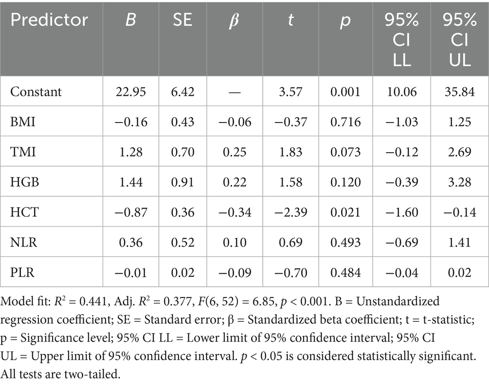 A multiple linear regression model was conducted to examine the predictive capacity of BMI, TMI, HGB, HCT, NLR, and PLR for body fat percentage (Table 3). The overall model was statistically significant, F(6, 52) = 6.85, p < 0.001, explaining 44.1% of the variance in body fat percentage (Adj. R2 = 0.377). Among the predictors, HCT emerged as a significant negative predictor (β = −0.34, p = 0.021), indicating that lower hematocrit values were associated with higher body fat percentages. TMI showed a positive but marginally non-significant association (β = 0.25, p = 0.073). BMI, HGB, NLR, and PLR were not significant predictors when controlling for other variables. Multicollinearity diagnostics indicated acceptable variance inflation factor (VIF) values for all predictors, and residual plots confirmed that the assumptions of linearity, homoscedasticity, and normality were met.