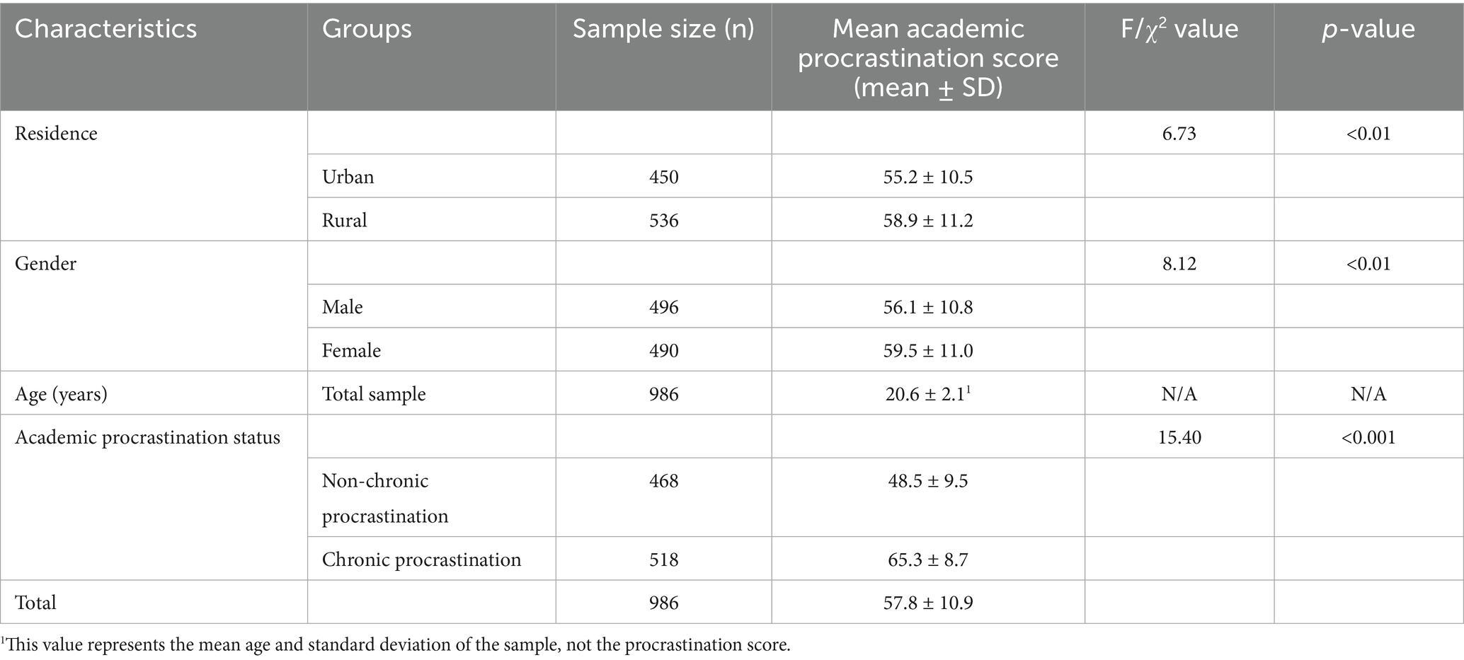 The Academic Procrastination Assessment Scale (PASS) used in this study is a Chinese version revised by Chen Baohua from East China Normal University based on the original work of Solomon and Rothblum (1984) (13). The scale comprises two parts: self-determined tasks and other-determined tasks, with test–retest reliabilities of 0.62 and 0.51, respectively. The test–retest reliability of the cause scale is 0.69, and the split-half reliability is 0.74, indicating good reliability and validity. The scale covers three dimensions: academic procrastination severity, problematicity, and expectation for change. The Chinese version of the PASS scale is divided into two parts. The first part assesses academic procrastination among college students, containing 18 items, each followed by three 5-point rating questions. Specific questions include the degree of task procrastination, problem severity, and willingness to change. The sum of the scores of the first two questions constitutes the total academic procrastination score, ranging from 12 to 60 points—higher scores indicate more severe procrastination. According to the criteria, scores below 24 indicate non-procrastination, scores from 24 to 35 indicate mild procrastination, 36–47 indicate moderate procrastination, and 48 or above indicate severe procrastination. For the descriptive analysis in this study, participants with non-procrastination or mild procrastination were categorized as having “Non-chronic procrastination,” while those with moderate or severe procrastination were categorized as having “Chronic procrastination.” The third question measures the intensity of the expectation to change procrastination, with scores ranging from 6 to 30—higher scores indicate stronger expectations. The second part explores the causes of academic procrastination, containing 26 items that provide specific scenarios (such as final exam review) and list 26 possible causes, requiring 5-point ratings. The scoring methods include two approaches: calculating the proportion of participants with high agreement on items and using principal component analysis to identify major procrastination factors.