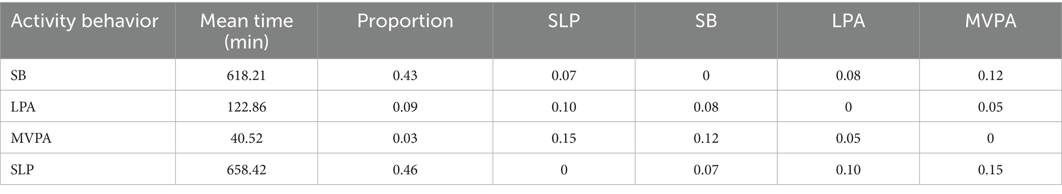 According to the compositional data variation matrix (Table 2), the log-ratio variance of sedentary behavior and sleep was, indicating a strong interdependence between these two behaviors. In contrast, MVPA showed larger log-ratio variances with other activities, meaning its time allocation was more stable. The log-ratio variance between sedentary behavior and sleep was also very low (0.07). Notably, the paired log-ratio variance between MVPA and LPA was the lowest among all pairs (0.05), suggesting that the highest probability of substitution occurred between these two forms of physical activity.