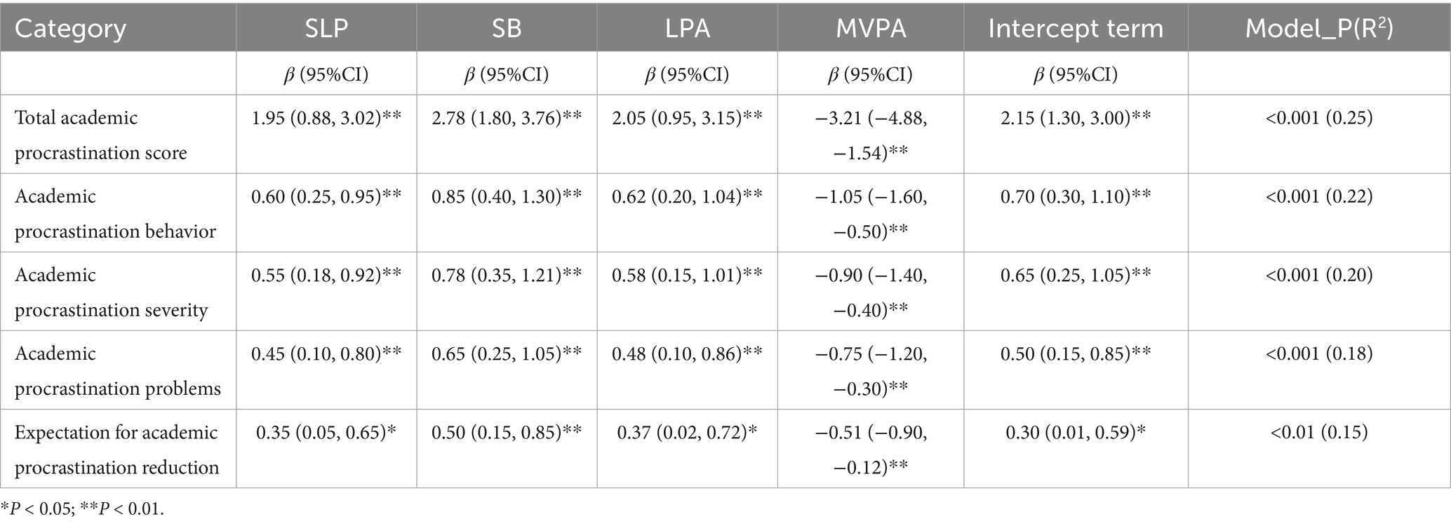 Regarding the relationship between physical activity and academic procrastination, the study found a significant negative correlation between physical activity levels and academic procrastination behavior. Specifically, college students with higher physical activity levels exhibited lower levels of academic procrastination. This finding further emphasizes the important role of physical activity in promoting academic development and mental health among college students. After adjusting for gender, age, and residence, multivariate linear regression analysis with compositional data was performed using isometric log-ratio (ilr)-transformed times of SB, SLP, LPA, and MVPA as independent variables, and total academic procrastination scores and dimensions (academic procrastination behavior, procrastination severity, procrastination problems, and expectation to reduce procrastination) as dependent variables to explore the relationship between 24-h activity time distribution and academic procrastination. Table 3 shows that 24-h activity behaviors were significantly associated with total academic procrastination scores and all dimensions (p < 0.01), among which the proportion of MVPA time showed significant negative correlations with both total academic procrastination scores and all dimensions.