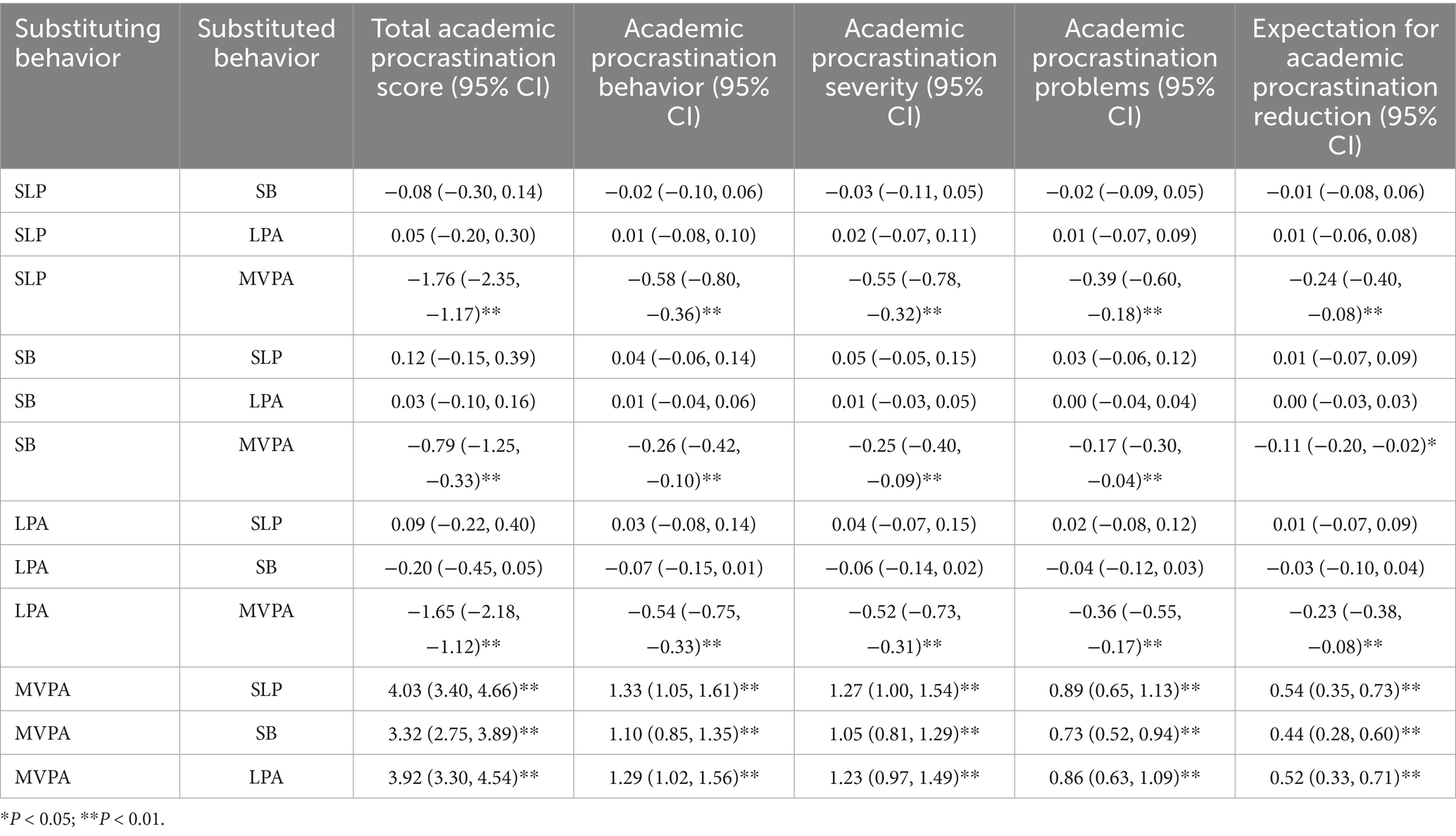 Table 4. Predicted value changes in academic procrastination behavior following 15-minute isotemporal substitution between 24 h activity behaviors.